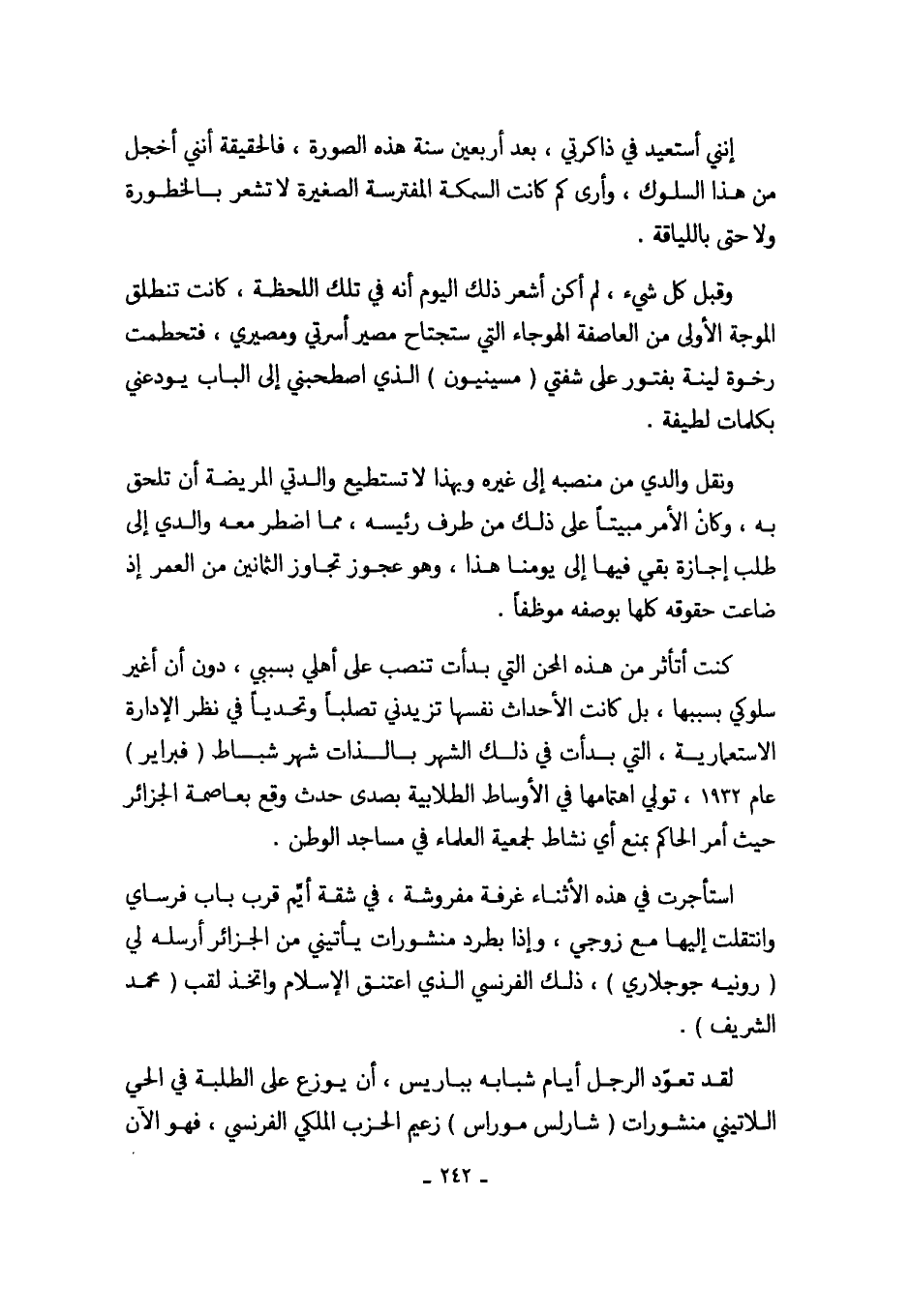 كنت أتأثر من هذه المحن التي بدأت تنصب على أهلي بسببي، دون أن أغير سلوكي بسببها، بل كانت الأحداث نفسها تزيدني تصلباً وتحدياً في نظر الإدارة الاستعمارية، التي بدأت في ذلك الشهر بالذات شهر شباط (فبراير) عام 1932، تولي اهتامها في الأوساط الطلابية بصدى حدث وقع بعاصة الجزائر حيث أمر الحاكم بمنع أي نشاط لجمعية العلماء في مساجد الوطن.