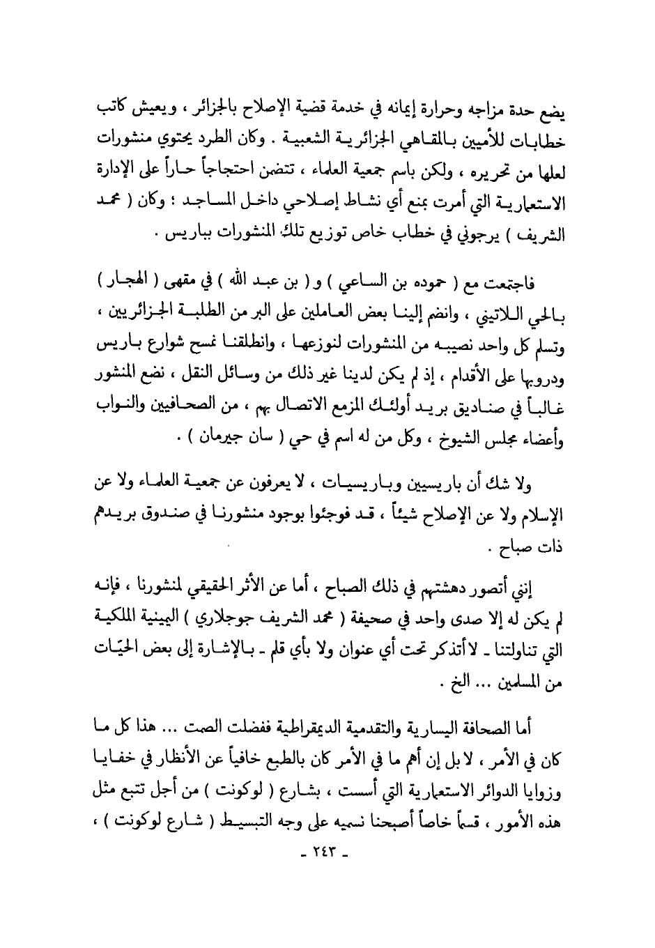 يضع حدة مزاجه وحرارة إيمانه في خدمة قضية الإصلاح بالجزائر، ويعيش كاتب خطابات للأميين بالمقاهي الجزائرية الشعبية. وكان الطرد يحتوي منشورات لعلها من تحريره، ولكن باسم جمعية العلماء، تتضمن احتجاجاً حاراً على الإدارة الاستعمارية التي أمرت بمنع أي نشاط إصلاحي داخل المساجد؛ وكان (محمد الشريف) يرجوني في خطاب خاص توزيع تلك المنشورات بباريس.