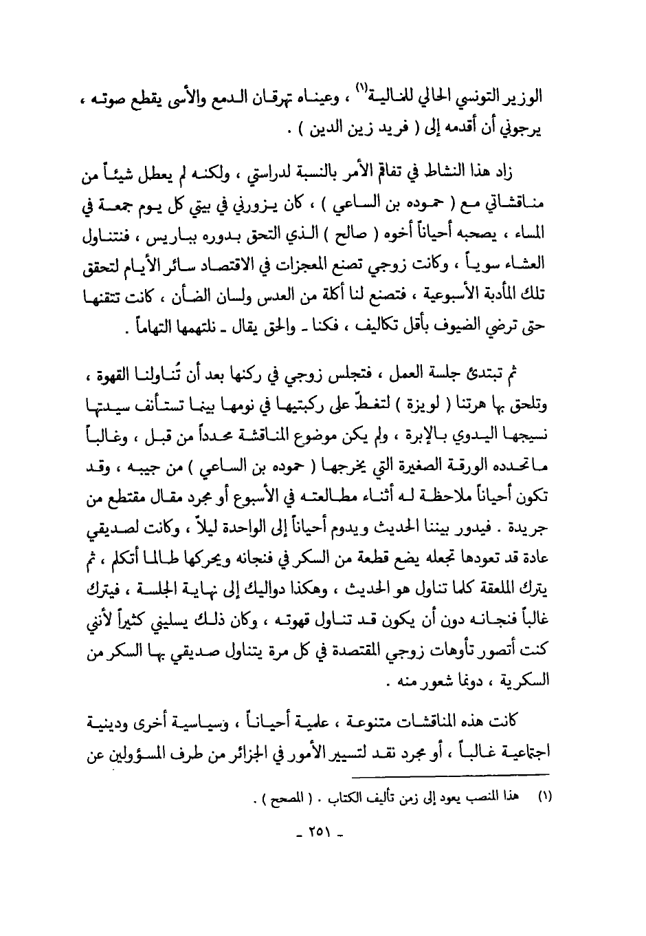 الوزير التونسي الحالي للمالية (¬1)، وعيناه تهرقان الدمع والأسى يقطع صوته، يرجوني أن أقدمه إلى (فريد زين الدين).