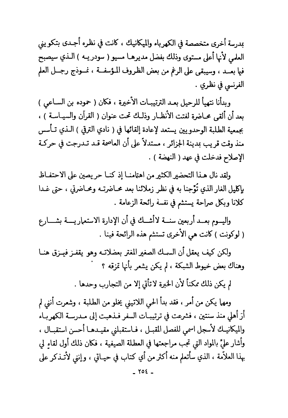وبدأنا نتهيأ للرحيل بعد الترتيبات الأخيرة، فكان (حموده بن الساعي) بعد أن ألقى محاضرة لفتت الأنظار وذلك تحت عنوان (القرآن والسياسة)، بجمعية الطلبة الوحدويين يستعد لإعادة إلقائها في (نادي الترقي) الذي تأسس منذ وقت قريب بمدينة الجرائر، مستدلاً على أن العاصمة قد تدرجت في حركة الإصلاح فدخلت في عهد (النهضة).