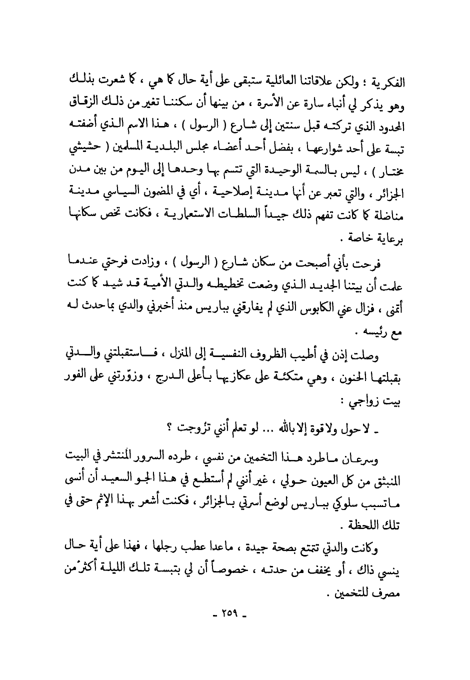 وسرعان ما طرد هذا التخمين من نفسي، طرده السرور المنتشر في البيت المنبثق من كل العيون حولي، غير أنني لم أستطع في هذا الجو السعيد أن أنسى ما تسبب سلوكي بباريس لوضع أسرتي بالجزائر، فكنت أشعر بهذا الإثم حتى في تلك اللحظة.