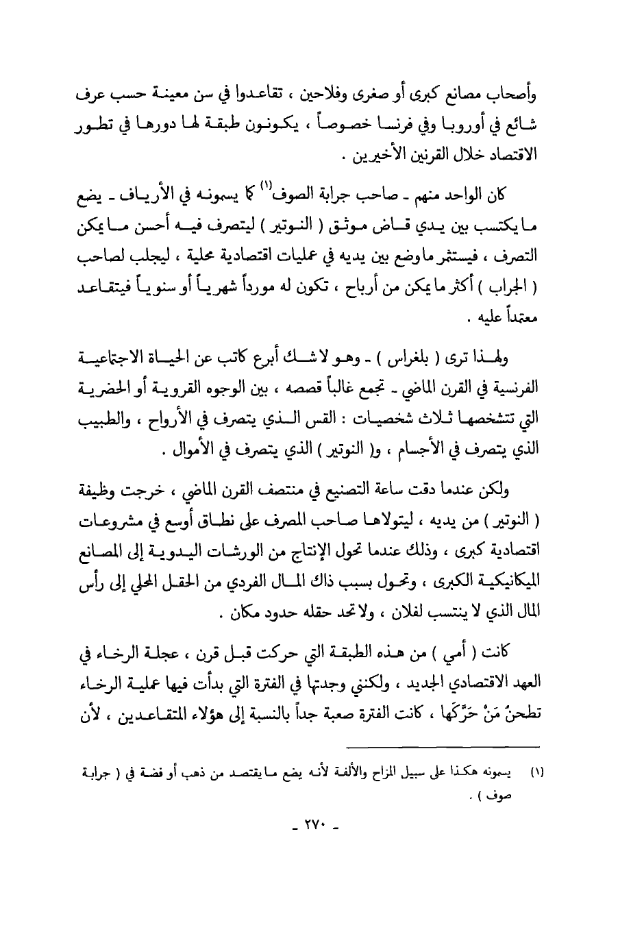 ولكن عندما دقت ساعة التصنيع في منتصف القرن الماضي، خرجت وظيفة (النوتير) من يديه، ليتولاها صاحب المصرف على نطاق أوسع في مشروعات اقتصادية كبرى، وذلك عندما تحول الإنتاج من الورشات اليدوية إلى المصانع الميكانيكية الكبرى، وتحول بسبب ذاك المال الفردي من الحقل المحلي إلى رأس المال الذي لا ينتسب لفلان، ولا تحد حقله حدود مكان.