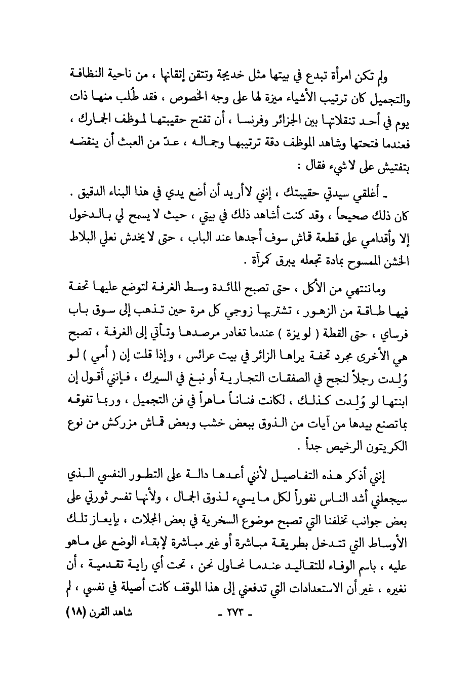 إنني أذكر هذه التفاصيل لأنني أعدها دالة على التطور النفسي الذي سيجعلني أشد الناس نفوراً لكل ما يسيء لذوق الجمال، ولأنها تفسر ثورتي على بعض جوانب تخلفنا التي تصبح موضوع السخرية في بعض المجلات، بإيعاز تلك الأوساط التي تتدخل بطريقة مباشرة أو غير مباشرة لإبقاء الوضع على ما هو عليه، باسم الوفاء للتقاليد عندما نحاول نحن، تحت أي راية تقدمية، أن نغيره، غير أن الاستعدادات التي تدفعني إلى هذا الموقف كانت أصيلة في نفسي، لم