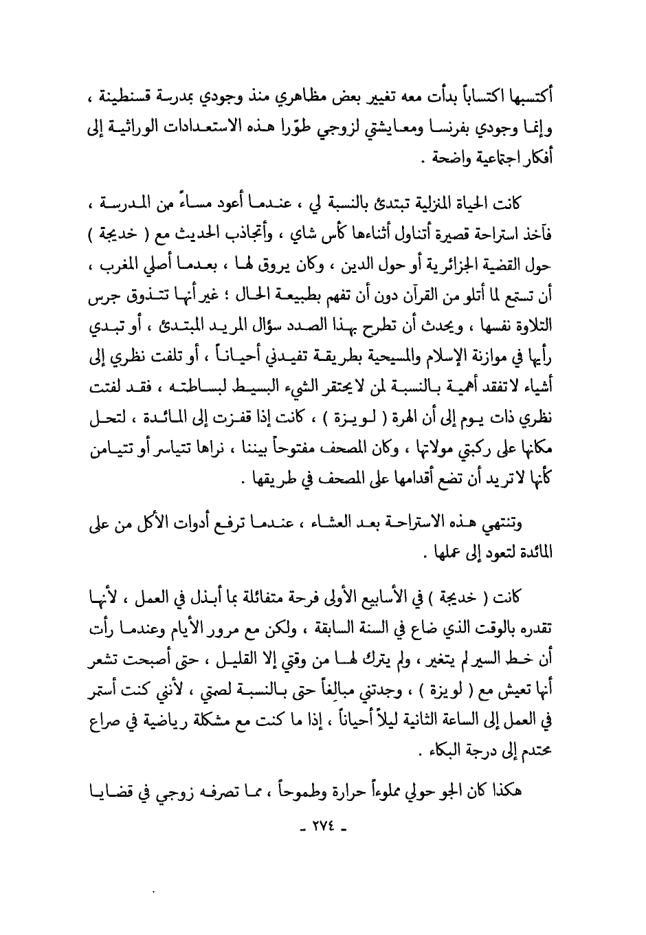 كانت الحياة المنزلية تبتدئ بالنسبة لي، عندما أعود مساء من المدرسة، فآخذ استراحة قصيرة أتناول أثناءها كأس شاي، وأتجاذب الحديث مع (خديجة) حول القضية الجزائرية أو حول الدين، وكان يروق لها، بعدما أصلي المغرب، أن تستمع لما أتلو من القرآن دون أن تفهم بطبيعة الحال؛ غير أنها تتذوق جرس التلاوة نفسها، ويحدث أن تطرح بهذا الصدد سؤال المريد المبتدئ، أو تبدي رأيها في موازنة الإسلام والمسيحية بطريقة تفيدني أحياناً، أو تلفت نظري إلى أشياء لا تفقد أهمية بالنسبة لمن لا يحتقر الشيء البسيط لبساطته، فقد لفتت نظري ذات يوم إلى أن الهرة (لويزة)، كانت إذا قفزت إلى المائدة، لتحل مكانها على ركبتي مولاتها، وكان المصحف مفتوحاً بيننا، نراها تتياسر أو تتيامن كأنها لا تريد أن تضع أقدامها على المصحف في طريقها.