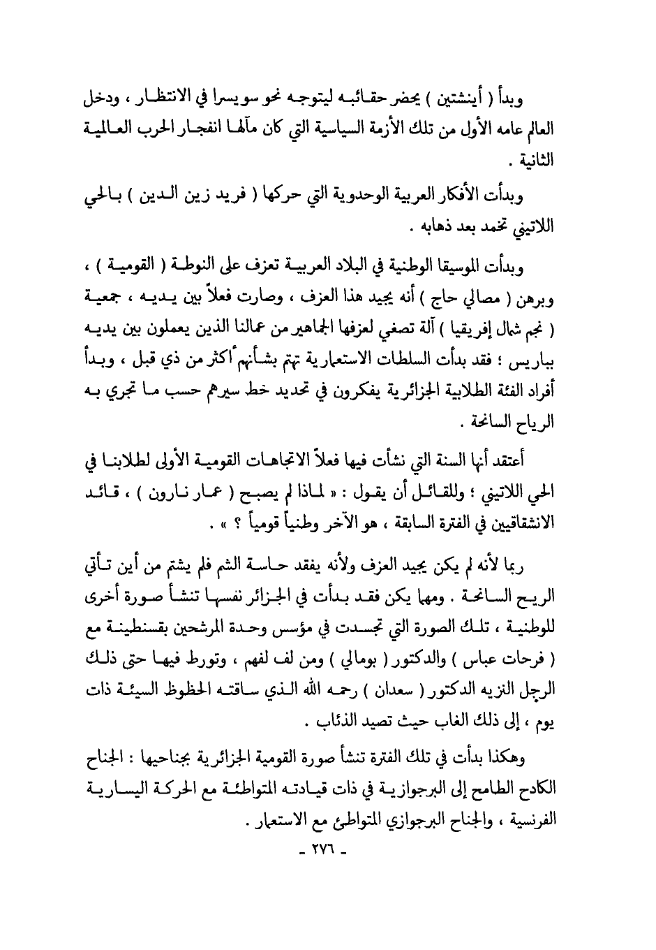 وبدأت الموسيقا الوطنية في البلاد العربية تعزف على النوطة (القومية)، وبرهن (مصالي حاج) أنه يجيد هذا العزف، وصارت فعلاً بين يديه، جمعية (نجم شمال إفريقيا) آلة تصغي لعزفها الجماهير من عمالنا الذين يعملون بين يديه بباريس؛ فقد بدأت السلطات الاستعمارية تهتم بشأنها أكثر من ذي قبل، وبدأ أفراد الفئة الطلابية الجزائرية يفكرون في تحديد خط سيرهم حسب ما تجري به الرياح السانحة.