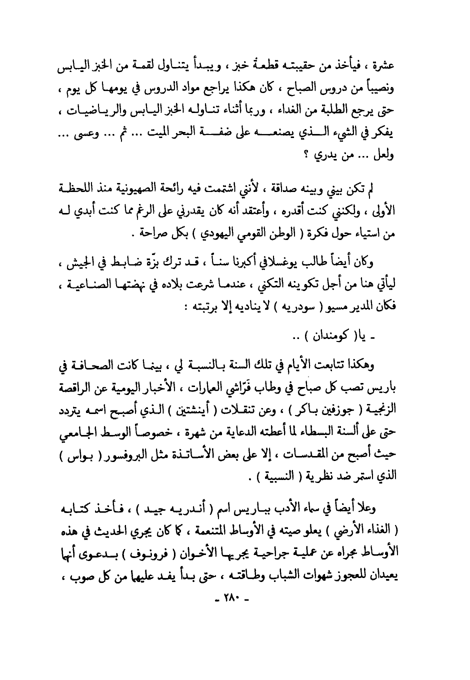 وهكذا تتابعت الأيام في تلك السنة بالنسبة لي، بينما كانت الصحافة في باريس تصب كل صباح في وطاب فَرّاشي العمارات، الأخبار اليومية عن الراقصة الزنجية (جوزفين باكر)، وعن تنقلات (أينشتين) الذي أصبح اسمه يتردد حتى على ألسنة البسطاء لما أعطته الدعاية من شهرة، خصوصاً الوسط الجامعي حيث أصبح من المقدسات، إلا على بعض الأساتذة مثل البروفسور (بواس) الذي استمر ضد نظرية (النسبية).