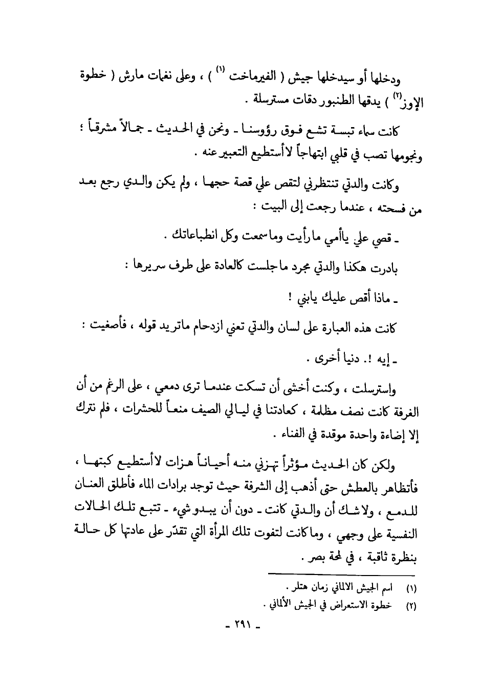 ولكن كان الحديث مؤثراً تهزني منه أحياناً هزات لا أستطيع كبتها، فأتظاهر بالعطش حتى أذهب إلى الشرفة حيث توجد برادات الماء فأطلق العنان للدمع، ولا شك أن والدتي كانت- دون أن يبدو شيء- تتبع تلك الحالات النفسية على وجهي، وما كانت لتفوت تلك المرأة التي تقدّر على عادتها كل حالة بنظرة ثاقبة، في لمحة بصر.
