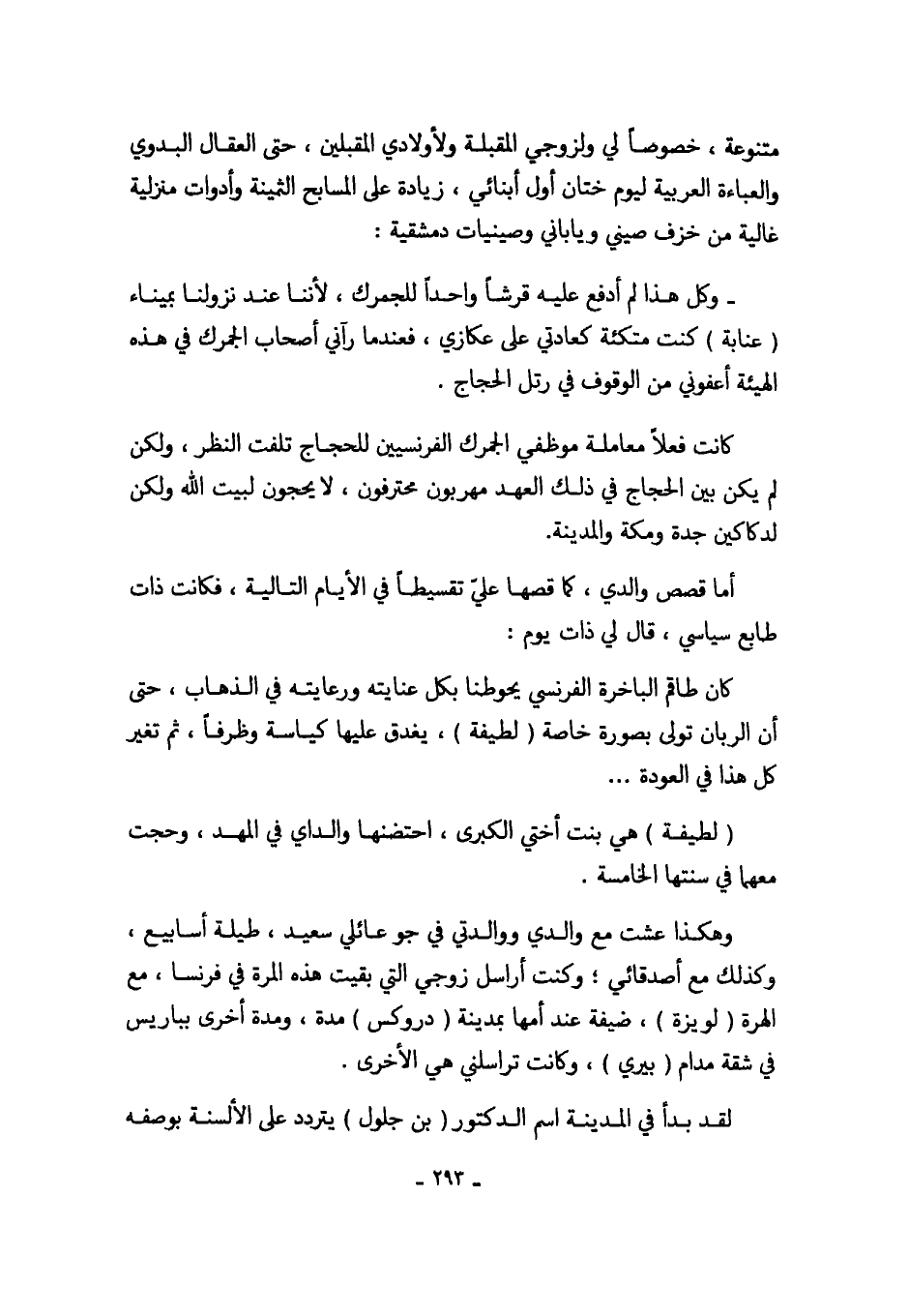 - وكل هذا لم أدفع عليه قرشاً واحداً للجمرك، لأننا عند نزولنا بميناء (عنابة) كنت متكئة عادتي على عكازي، فعندما رآني أصحاب الجمرك في هذه الهيئة أعفوني من الوقوف في رتل الحجاج.