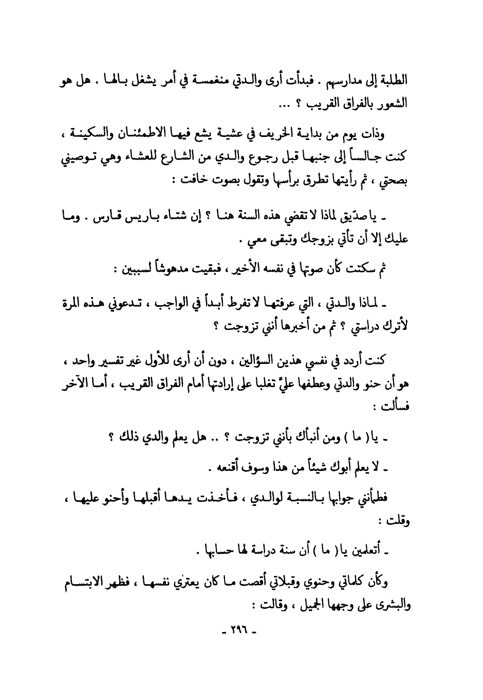 - لماذا والدتي، التي عرفتها لا تفرط أبداً في الواجب، تدعوني هذه المرة لأترك دراستي؟ ثم من أخبرها أتن تزوجت؟