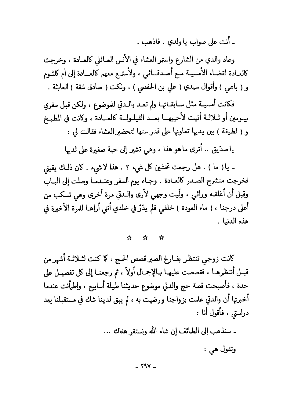 - يا (ما). هل رجعت تخشين كل شيء؟. هذا لا شيء. كان ذلك يقيني فخرجت منشرح الصدر كالعادة. وجاء يوم السفر وعندما وصلت إلى الباب وقبل أن أغلقه ورائي، ولّيت وجهي لأرى والدتي مرة أخرى وهي تسكب من أعلى درجنا، (ماء العودة) خلفي فلم يذُرْ في خلدي أنني أراها للمرة الأخيرة في هذه الدنيا.