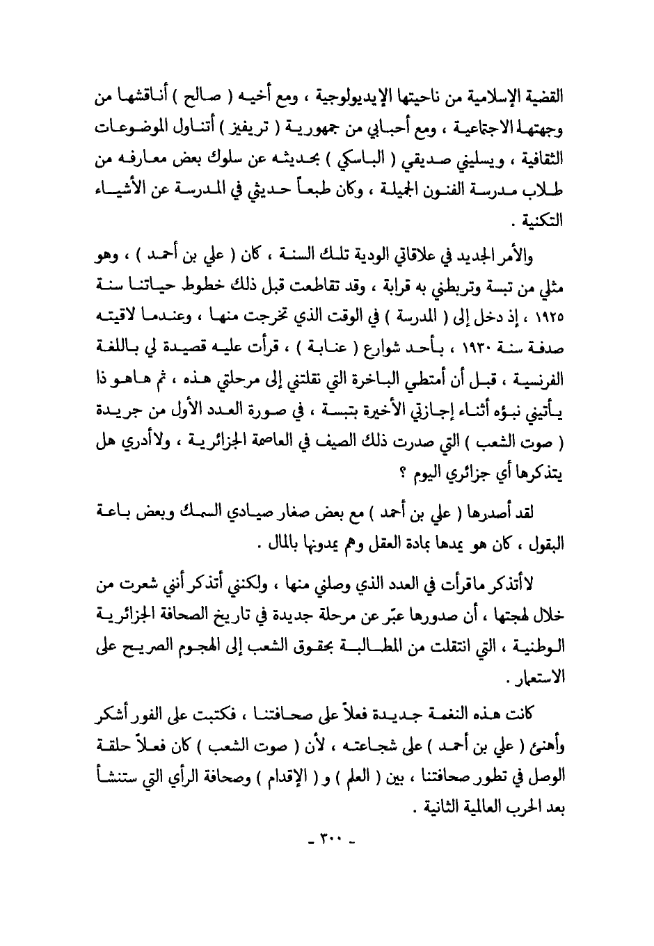 والأمر الجديد في علاقاتي الودية تلك السنة، كان (علي بن أحمد)، وهو مثلي من تبسة وتربطني به قرابة، وقد تقاطعت قبل ذلك خطوط حياتنا سنة 1925، إذ دخل إلى (المدرسة) في الوقت الذي تخرجت منها، وعندما لاقيته صدفة سنة 1930، بأحد شوارع (عنابة)، قرأت عليه قصيدة لي باللغة الفرنسية، قبل أن أمتطي الباخرة التي نقلتني إلى مرحلتي هذه، ثم ها هو ذا يأتيني نبؤه أثناء إجازتي الأخيرة بتبسة، في صورة العدد الأول من جريدة (صوت الشعب) التي صدرت ذلك الصيف في العاصمة الجزائرية، ولا أدري هل يتذكرها أي جزائري اليوم؟