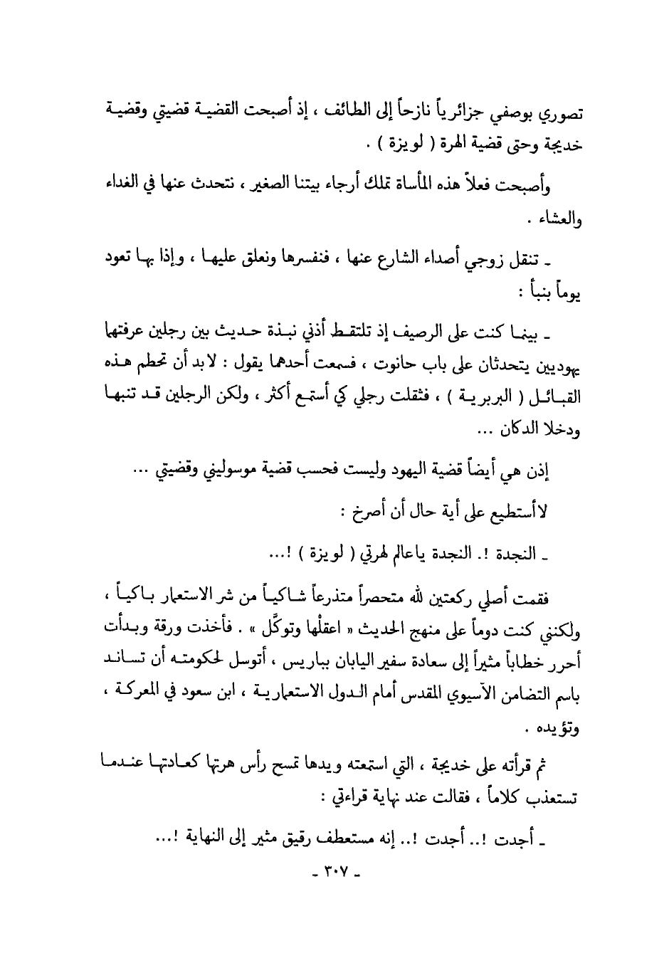 - بينما كنت على الرصيف إذ تلتقط أذني نبذة حديث بين رجلين عرفتهما يهوديين يتحدثان على باب حانوت، فسمعت أحدهما يقول: لا بد أن تحطم هذه القبائل (البربرية)، فثقلت رجلي كي أستمع أكثر، ولكن الرجلين قد تنبها ودخلا الدكان ...