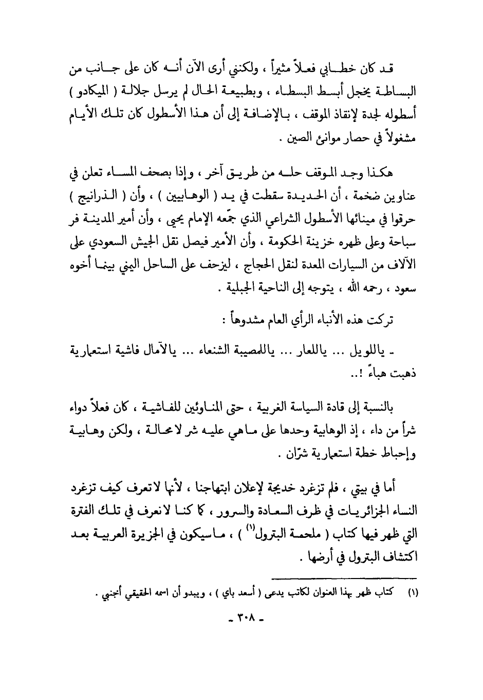 أما في بيتي، فلم تزغرد خديجة لإعلان ابتهاجنا، لأنها لا تعرف كيف تزغرد النساء الجزائريات في ظرف السعادة والسرور، كما كنا لا نعرف في تلك الفترة التي ظهر فيها كتاب (ملحمة البترول (¬1))، ما سيكون في الجزيرة العربية بعد اكتشاف البترول في أرضها.
