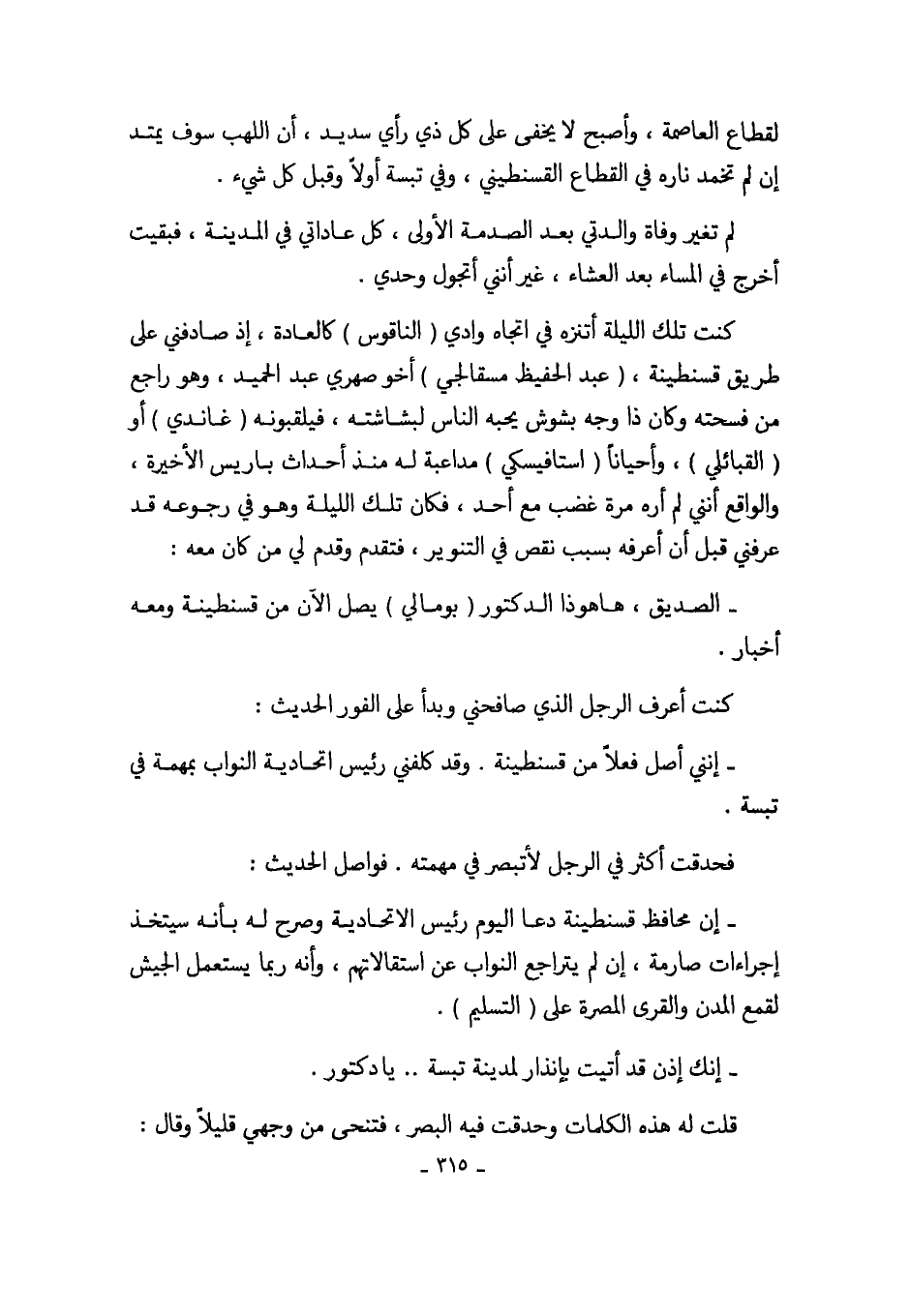كنت تلك الليلة أتنزه في اتجاه وادي (الناقوس) كالعادة، إذ صادفني على طريق قسنطينة، (عبد الحفيظ مسقالجي) أخو صهري عبد الحميد، وهو راجع من فسحته وكان ذا وجه بشوش يحبه الناس لبشاشته، فيلقبونه (غاندي) أو (القبائلي)، وأحياناً (استافيسكي) مداعبة له منذ أحداث باريس الأخيرة، والواقع أنني لم أره مرة غضب مع أحد، فكان تلك الليلة وهو في رجوعه قد عرفني قبل أن أعرفه بسبب نقص في التنوير، فتقدم وقدم لي من كان معه: