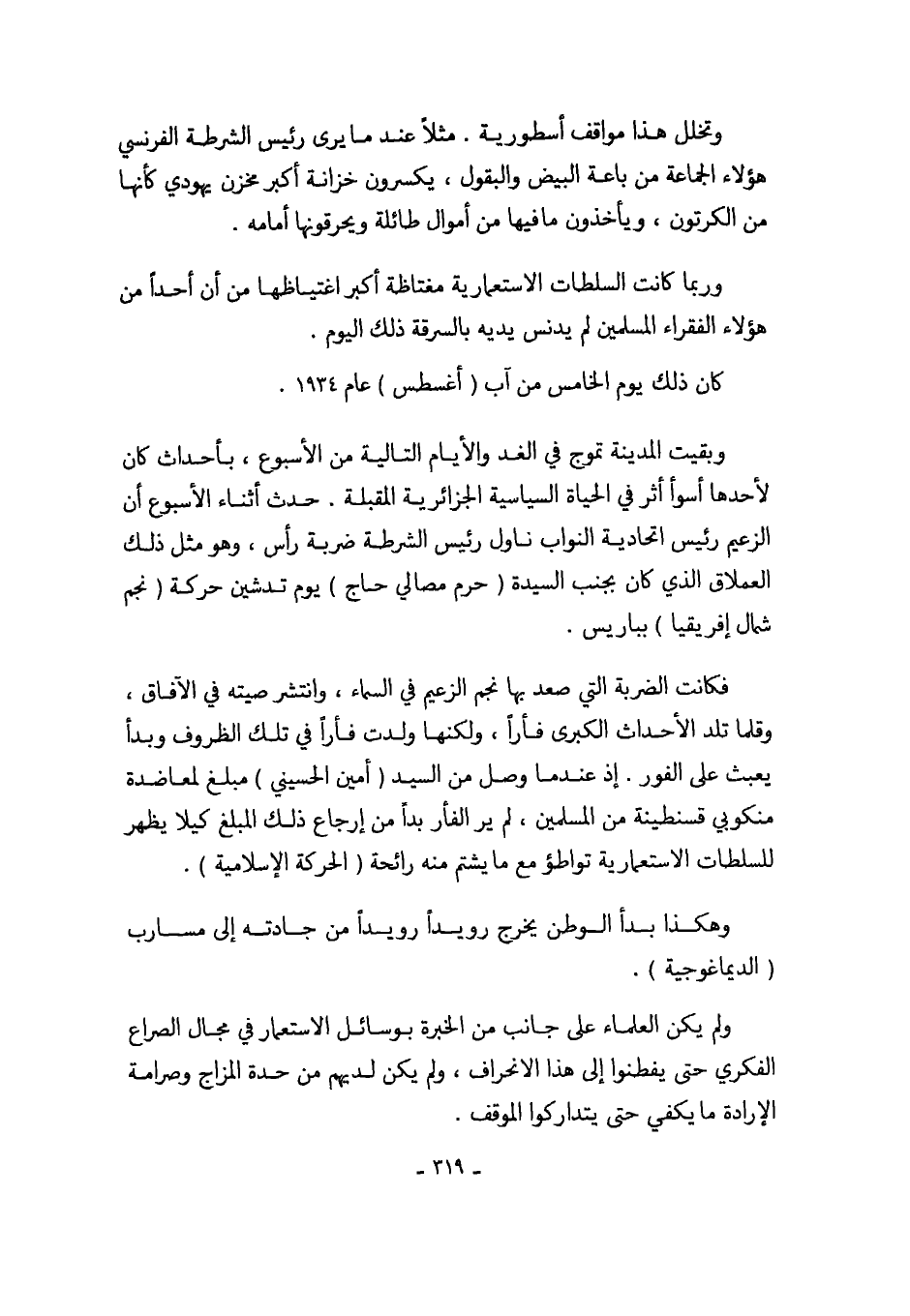 وبقيت المدينة تموج في الغد والأيام التالية من الأسبوع، بأحداث كان لأحدها أسوأ أثر في الحياة السياسية الجزائرية المقبلة. حدث أثناء الأسبوع أن الزعيم رئيس اتحادية النواب ناول رئيس الشرطة ضربة رأس، وهو مثل ذلك العملاق الذي كان بجنب السيدة (حرم مصالي حاج) يوم تدشين حركة (نجم شمال إفريقيا) بباريس.
