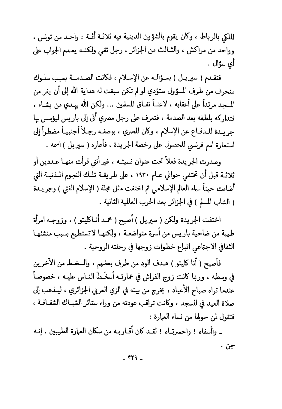 فتقدم (سيريل) بسؤاله عن الإسلام، فكانت الصدمة بسبب سلوك منحرف من طرف المسؤول ستؤدي لو لم تكن سبقت له هداية الله إلى أن يفر من المسجد مرتداً على أعقابه، لاعناً نفاق المسلمين ... ولكن الله يهدي من يشاء، فتداركه بلطفه بعد الصدمة، فتعرف على رجل مصري أتى إلى باريس ليؤسس بها جريدة للدفاع عن الإسلام، وكان المصري، بوصعفه رجلاً أجنبياً مضطراً إلى استعارة اسم فرنسي للحصول على رخصة الجريدة، فأعاره (سيريل) اسمه.