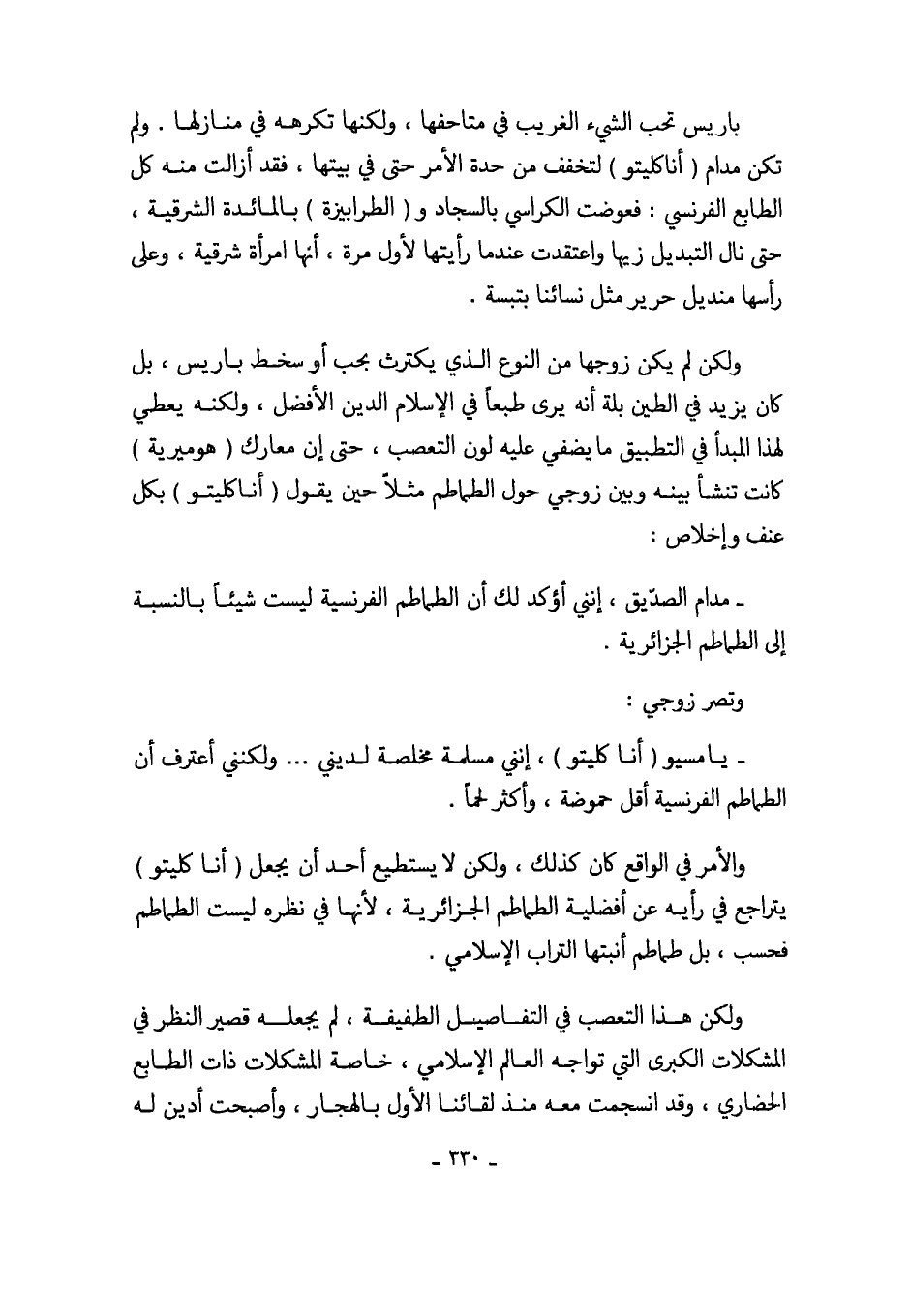 ولكن لم يكن زوجها من النوع الذي يكترث بحب أو سخط باريس، بل كان يزيد في الطين بلة أنه يرى طبعاً في الإسلام الدين الأفضل، ولكنه يعطي لهذا المبدأ في التطبيق ما يضفي عليه لون التعصب، حتى إن معارك (هوميرية) كانت تنشأ بينه وبين زوجي حول الطماطم مثلاًحين يقول (أنا كليتو) بكل عنف وإخلاص: