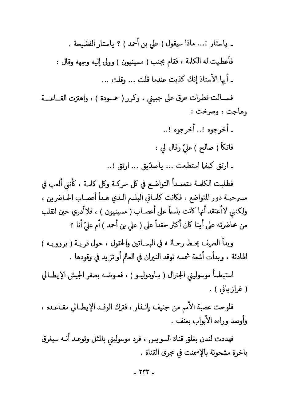فطلبت الكلمة متعمداً التواضع في كل حركة وكل كلمة، كأنني ألعب في مسرحية دور المتواضع، فكانت كلماتي البلسم الذي هدأ أعصاب الحاضرين، ولكنني لا أعتقد أنها كانت بلسماً على أعصاب (مسينيون)، فلا أدري حين انقلب من محاضرته على أينا كان أكثر حقداً على (علي بن أحمد) أم عليّ أنا؟