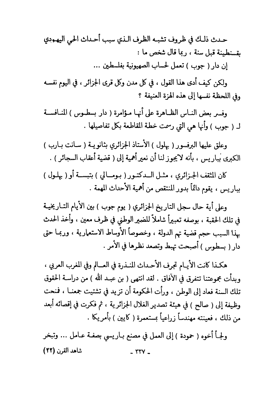 كان المثقف الجزائري، مثل الدكتور (بومالي) بتبسة أو (بهلول) بباريس، يقوم دائماً بدور المنتقص من أهمية الأحداث المهمة.