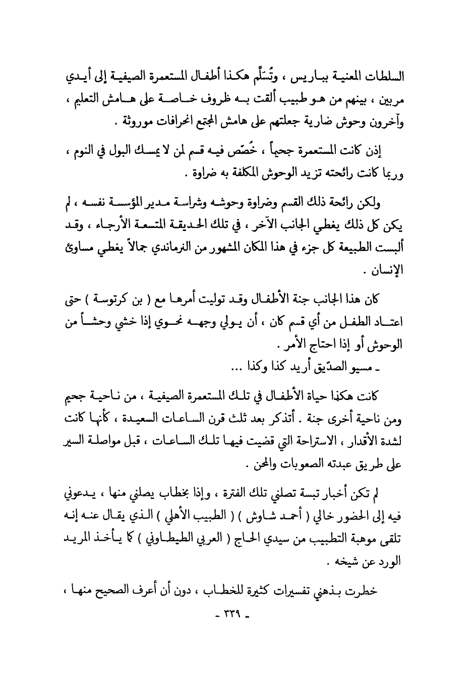 كانت هكذا حياة الأطفال في تلك المستعمرة الصيفية، من ناحية جحيم ومن ناحية أخرى جنة. أتذكر بعد ثلث قرن الساعات السعيدة، كأنها كانت لشدة الأقدار، الاستراحة التي قضيت فيها تلك الساعات، قبل مواصلة السير على طريق عبدته الصعوبات والمحن.