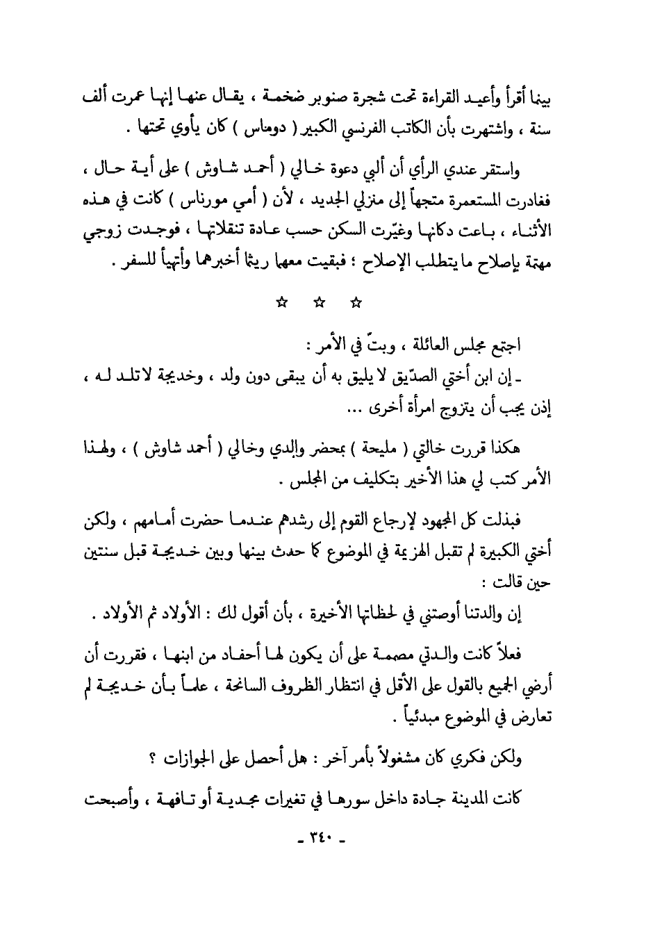 واستقر عندي الرأي أن ألبي دعوة خالي (أحمد شاوش) على أية حال، فغادرت المستعمرة متجهاً إلى منزلي الجديد، لأن (أمي مورناس) كانت في هذه الأثناء، باعت دكانها وغيّرت السكن حسب عادة تنقلاتها، فوجدت زوجي مهتمة بإصلاح ما يتطلب الإصلاح؛ فبقيت معهما ريثما أخبرهما وأتهيأ للسفر.