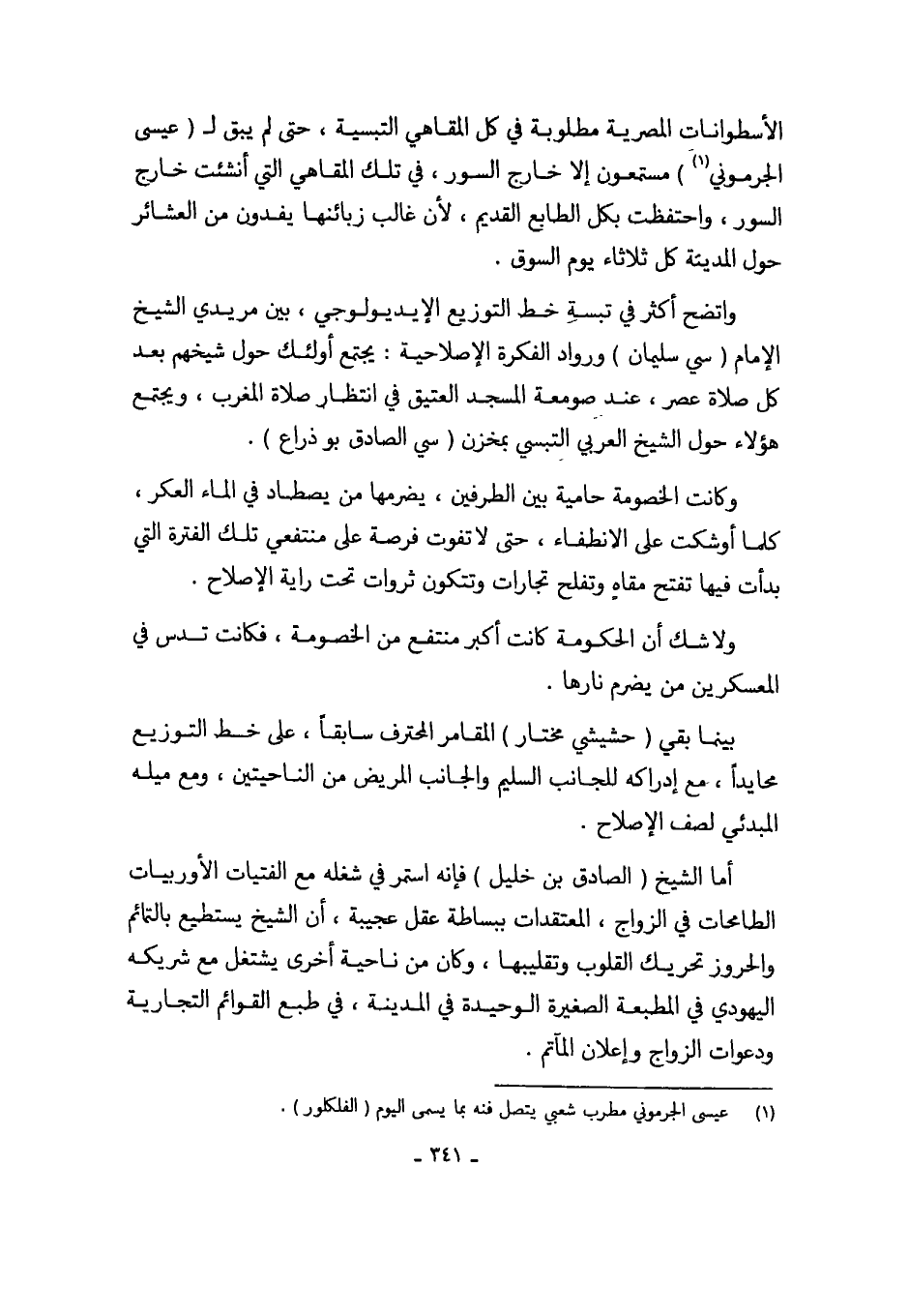الأسطوانات المصرية مطلوبة في كل المقاهي التبسية، حتى لم يبق لـ (عيسى الجرموني (¬1)) مستمعون إلا خارج السور، في تلك المقاهي التي أنشئت خارج السور، واحتفظت بكل الطابع القديم، لأن غالب زبائنها يفدون من العشائر حول المدينة كل ثلاثاء يوم السوق.
