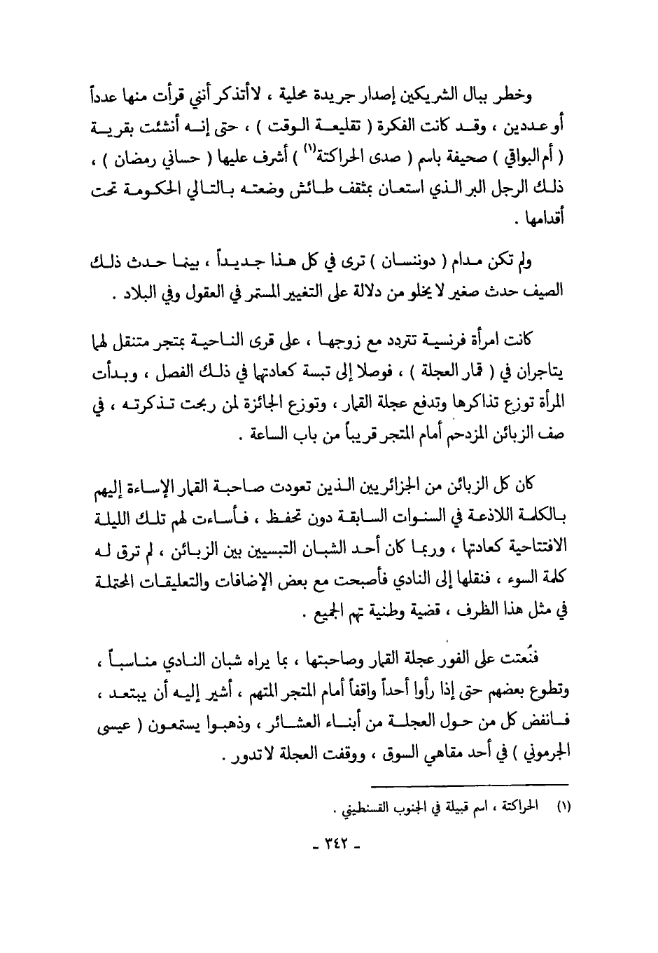 وخطر ببال الشريكين إصدار جريدة محلية، لا أتذكر أنني قرأت منها عدداً أو عددين، وقد كانت الفكرة (تقليعة الوقت)، حتى إنه أنشئت بقرية (أم البواقي) صحيفة باسم (صدى الحراكتة (¬1)) أشرف عليها (حساني رمضان)، ذلك الرجل البر الذي استعان بمثقف طائش وضعته بالتالي الحكومة تحت أقدامها.