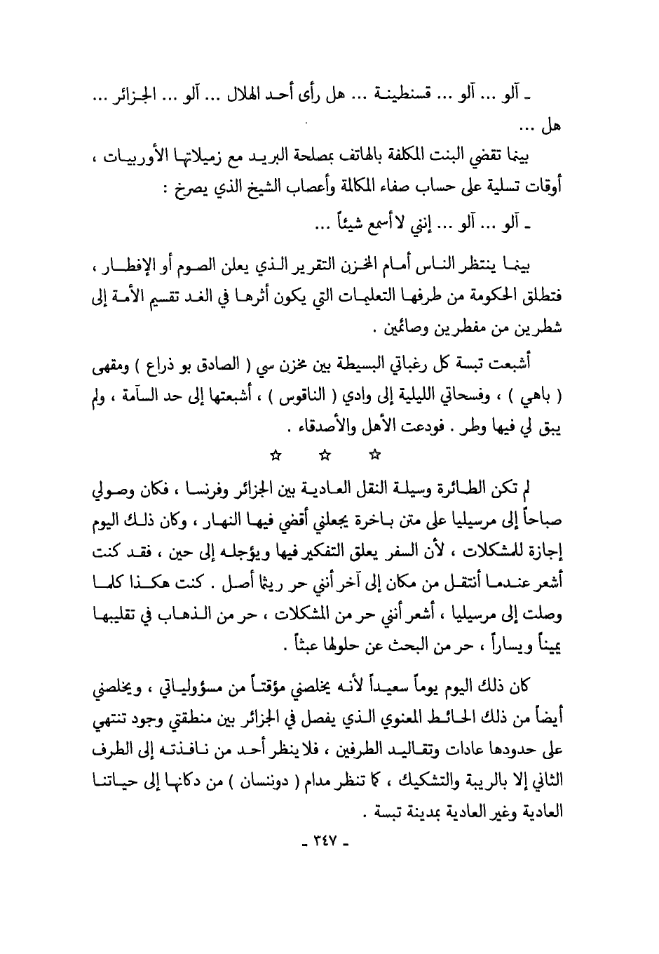 كان ذلك اليوم يوماً سعيداً لأنه يخلصني مؤقتاً من مسؤولياتي، ويخلصني أيضاً من ذلك الحائط المعنوي الذي يفصل في الجزائر بين منطقتي وجود تنتهي على حدودها عادات وتقاليد الطرفين، فلا ينظر أحد من نافذته إلى الطرف الثاني إلا بالريبة والتشكيك، كما تنظر مدام (دوننسان) من دكانها إلى حياتنا العادية وغير العادية بمدينة تبسة.