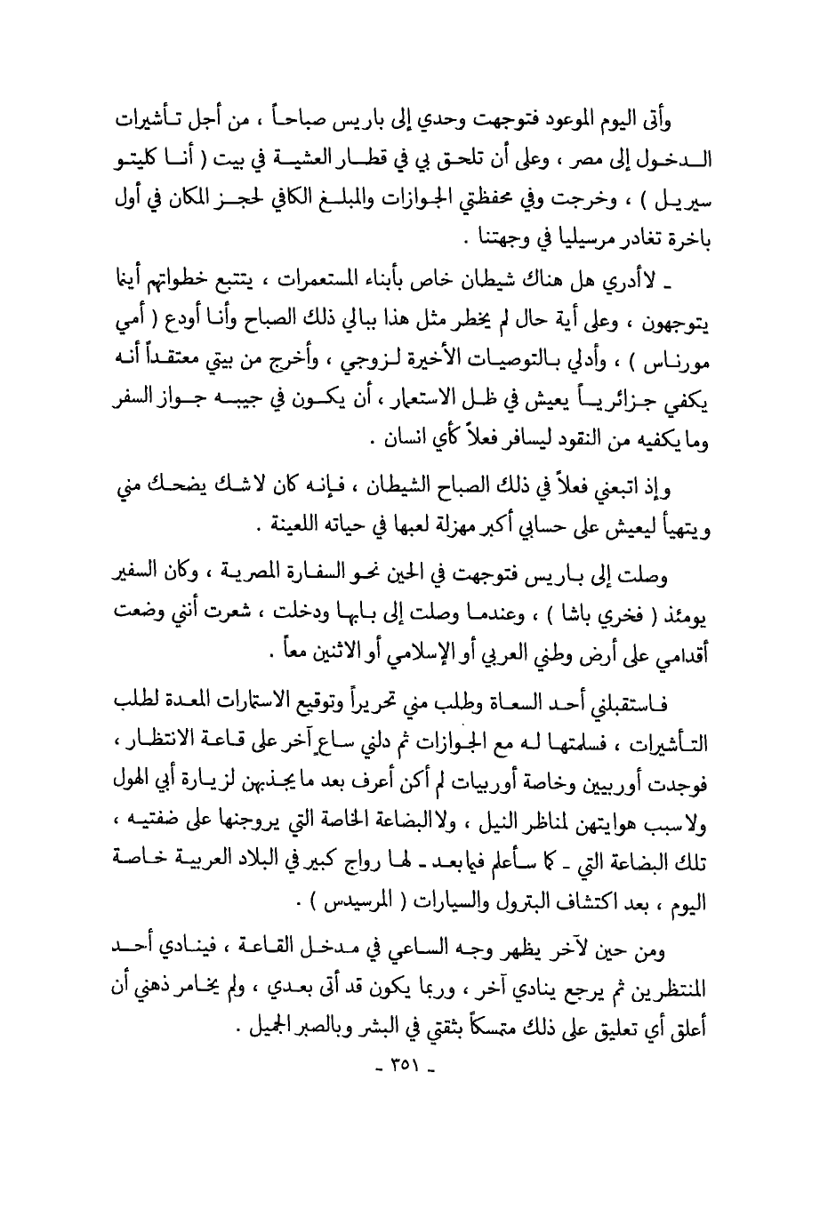 - لا أدري هل هناك شيطان خاص بأبناء المستعمرات، يتتبع خطواتهم أينما يتوجهون، وعلى أية حال لم يخطر مثل هذا ببالي ذلك الصباح وأنا أودع (أمي مورناس)، وأدلي بالتوصيات الأخيرة لزوجي، وأخرج من بيتي معتقداً أنه يكفي جزائرياً يعيش في ظل الاستعمار، أن يكون في جيبه جواز السفر وما يكفيه من النقود ليسافر فعلاً كأي انسان.