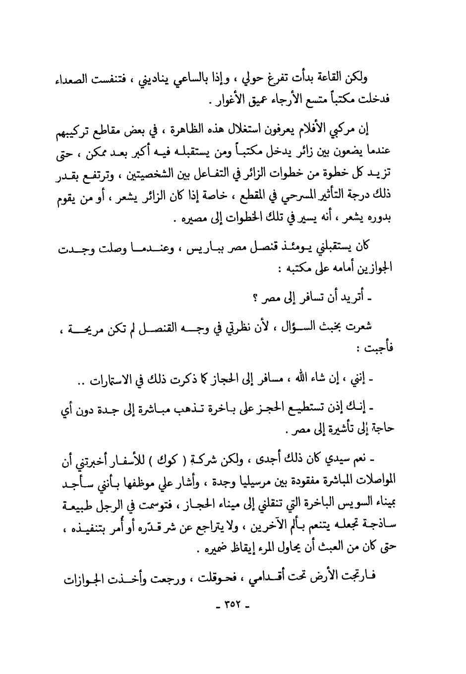 - نعم سيدي كان ذلك أجدى، ولكن شركة (كوك) للأسفار أخبرتني أن المواصلات المباشرة مفقودة بين مرسيليا وجدة، وأشار علي موظفها بأنني سأجد بميناء السويس الباخرة التي تنقلني إلى ميناء الحجاز، فتوسمت في الرجل طبيعة ساذجة تجعله يتنعم بألم الآخرين، ولا يتراجع عن شر قدّره أو أُمر بتنفيذه، حتى كان من العبث أن يحاول المرء إيقاظ ضميره.