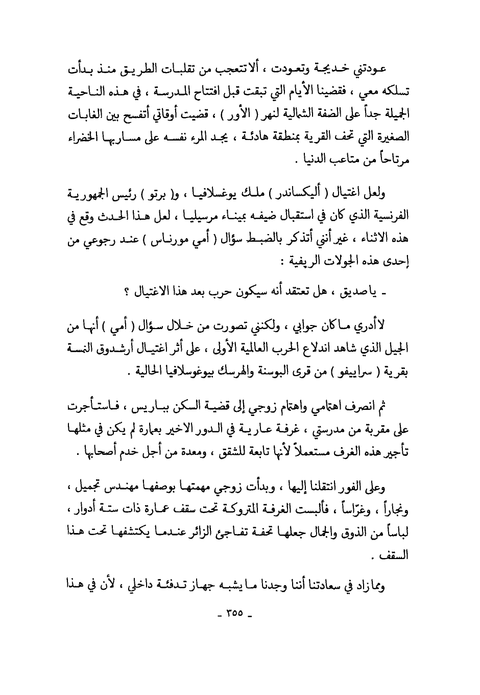 ولعل اغتيال (أليكساندر) ملك يوغسلافيا، و (برتو) رئيس الجمهورية الفرنسية الذي كان في استقبال ضيفه بميناء مرسيليا، لعل هذا الحدث وقع في هذه الأثناء، غير أنني أتذكر بالضبط سؤال (أمي مورناس) عند رجوعي من إحدى هذه الجولات الريفية: