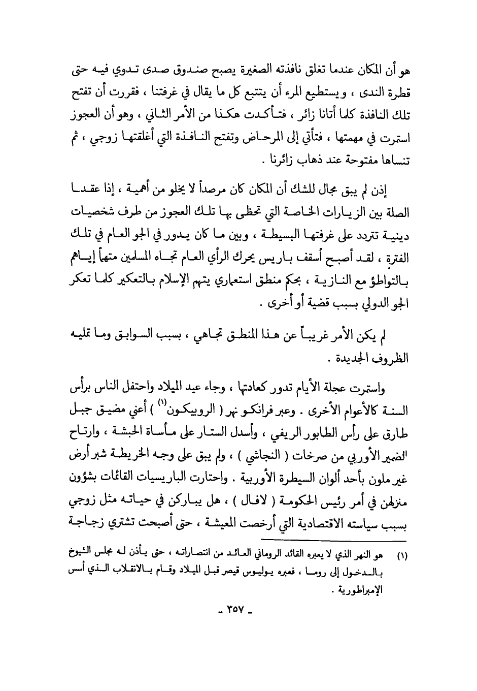 إذن لم يبق مجال للشك أن المكان كان مرصداً لا يخلو من أهمية، إذا عقدنا الصلة بين الزيارات الخاصة التي تحظى بها تلك العجوز من طرف شخصيات دينية تتردد على غرفتها البسيطة، وبين ما كان يدور في الجو العام في تلك الفترة، لقد أصبح أسقف باريس يحرك الرأي العام تجاه المسلمين متهماً إياهم بالتواطؤ مع النازية، بحكم منطق استعماري يتهم الإسلام بالتعكير كلما تعكر الجو الدولي بسبب قضية أو أخرى.