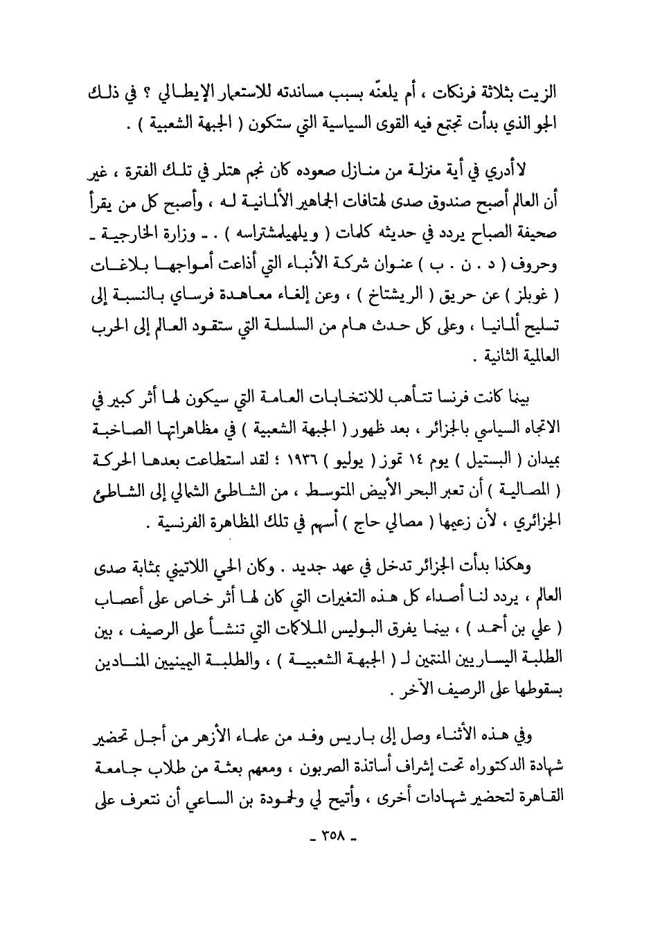 بينما كانت فرنسا تتأهب للانتخابات العامة التي سيكون لها أثر كبير في الاتجاه السياسي بالجزائر، بعد ظهور (الجبهة الشعبية) في مظاهراتها الصاخبة بميدان (البستيل) يوم 14 تموز (يوليو) 1936؛ لقد استطاعت بعدها الحركة (المصالية) أن تعبر البحر الأبيض المتوسط، من الشاطئ الشمالي إلى الشاطئ الجزائري، لأن زعيمها (مصالي حاج) أسهم في تلك المظاهرة الفرنسية.