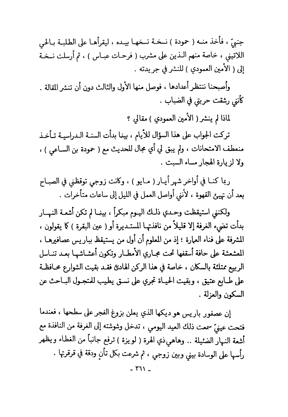 ولكنني استيقظت وحدي ذلك اليوم مبكراً، بينما لم تكن أشعة النهار بدأت تضيء الغرفة إلا قليلاً من نافذتها المستديرة أو (عين البقرة) كما يقولون، المشرفة على فناء العمارة؛ إذ من المعلوم أن أول من يستيقظ بباريس عصافيرها، المعشعشة على حافة أسقفها تحت مجاري الأمطار وتكون أعشاشها بعد تناسل الربيع ممتلئة بالسكان، خاصة في هذا الركن الهادئ فقد بقيت الشوارع محافظة على طابع عتيق، وبقيت الحياة تجري على نسق يطيب للمتجول الباحث عن السكون والعزلة.
