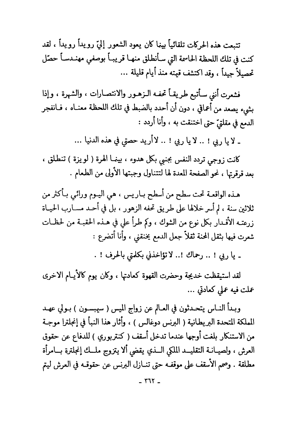 فشعرت أنني سأتبع طريقاً تحفه الزهور والانتصارات، والشهرة، وإذا بشيء يصعد من أعماقي، دون أن أحدد بالضبط في تلك اللحظة معناه، فانفجر الدمع في مقلتيّ حتى اختنقت به، وأنا أردد: