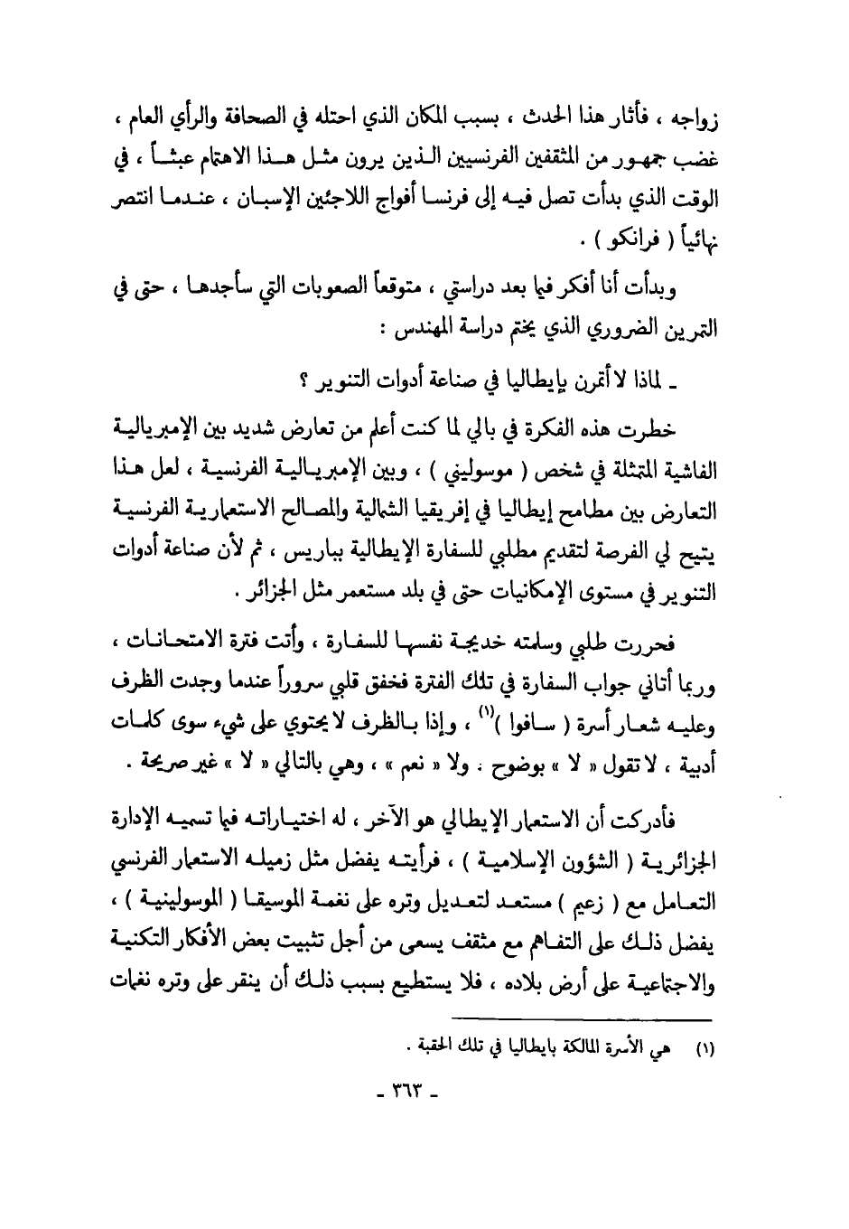 خطرت هذه الفكرة في بالي لما كنت أعلم من تعارض شديد بين الإمبريالية الفاشية المتمثلة في شخص (موسوليني)، وبين الإمبريالية الفرنسية، لعل هذا التعارض بين مطامح إيطاليا في إفريقيا الشمالية والمصالح الاستعمارية الفرنسية يتيح لي الفرصة لتقديم مطلبي للسفارة الإيطالية بباريس، ثم لأن صناعة أدوات التنوير في مستوى الإمكانيات حتى في بلد مستعمر مثل الجزائر.