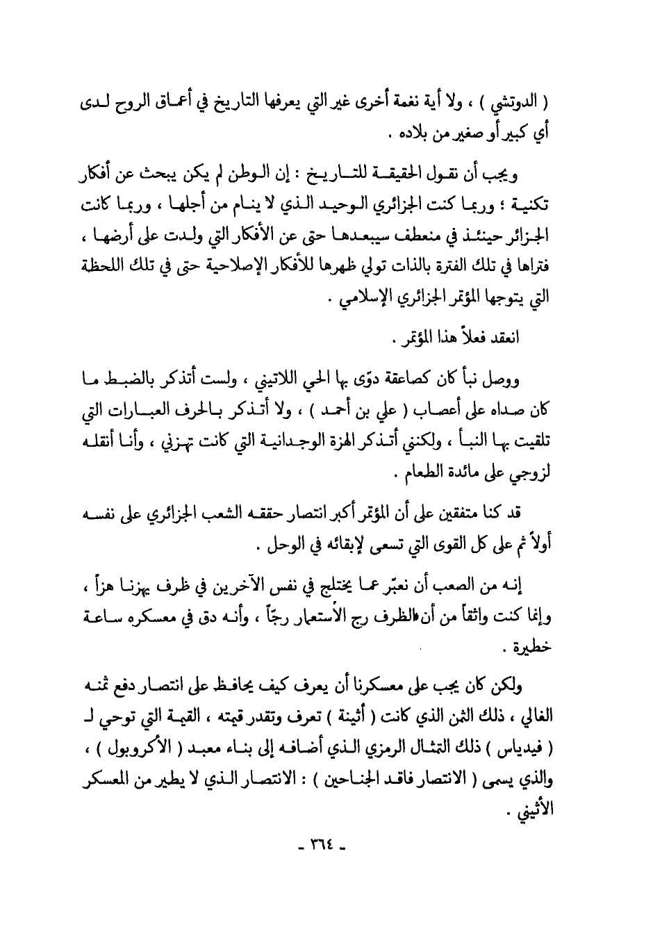 ويجب أن نقول الحقيقة للتاريخ: إن الوطن لم يكن يبحث عن أفكار تكنية؛ وربما كنت الجزائري الوحيد الذي لا ينام من أجلها، وربما كانت الجزائر حينئذ في منعطف سيبعدها حتى عن الأفكار التي ولدت على أرضها، فتراها في تلك الفترة بالذات تولي ظهرها للأفكار الإصلاحية حتى في تلك اللحظة التي يتوجها المؤتمر الجزائري الإسلامي.