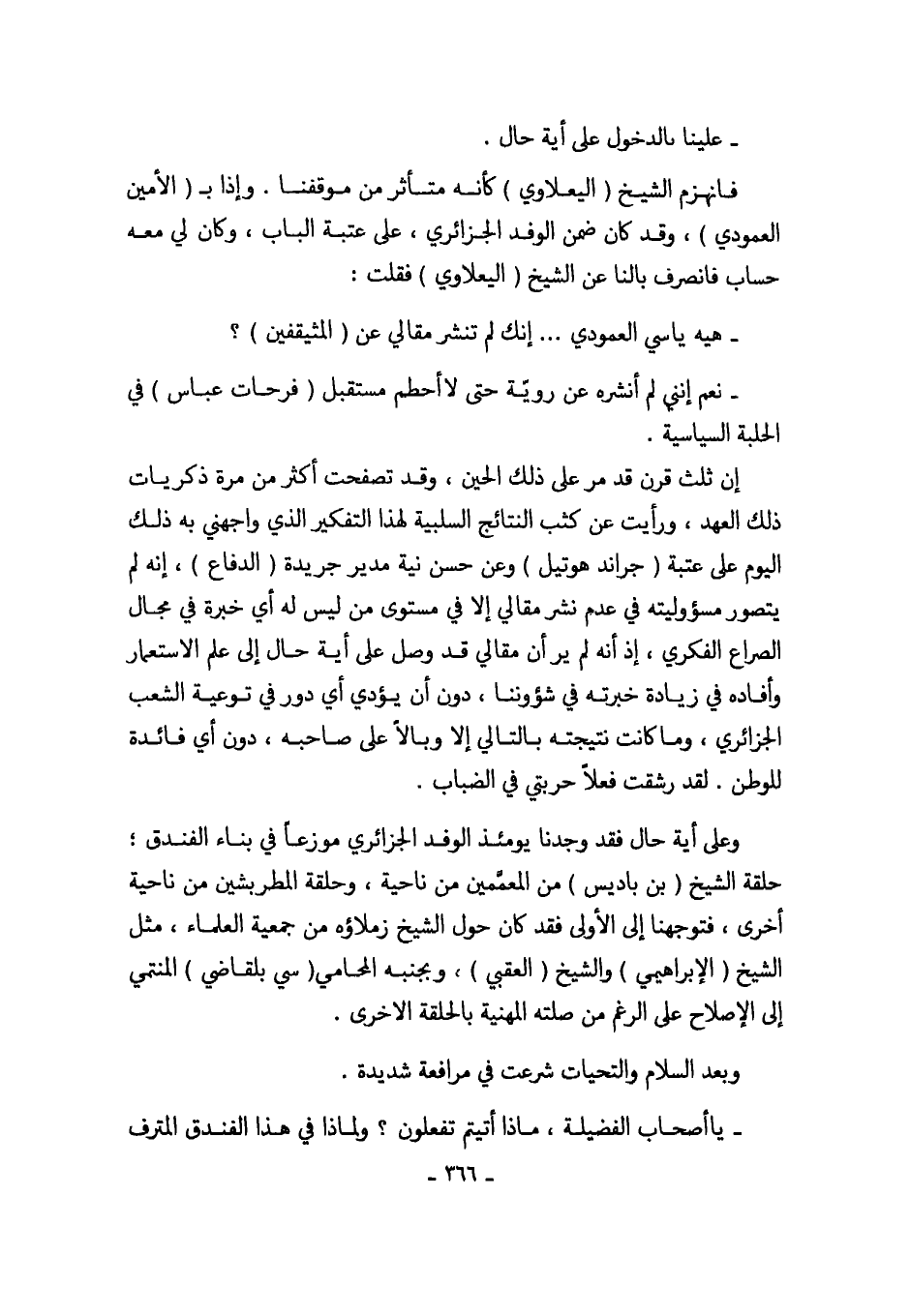فانهزم الشيخ (اليعلاوي) كأنه متأثر من موقفنا. وإذا بـ (الأمين العمودي)، وقد كان ضمن الوفد الجزائري، على عتبة الباب، وكان لي معه حساباً فانصرف بالنا عن الشيخ (اليعلاوي) فقلت:
