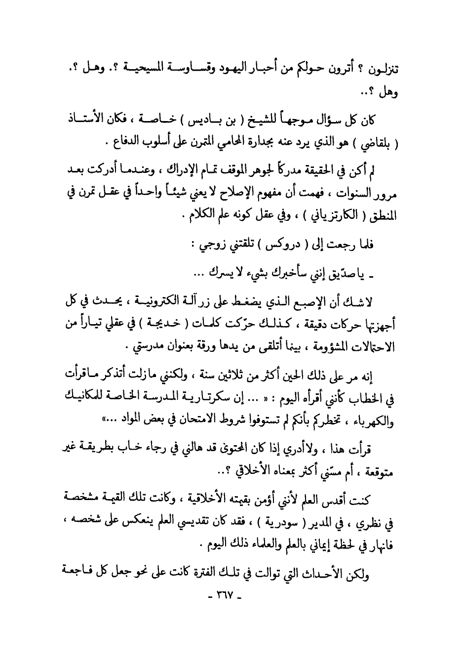 كنت أقدس العلم لأنني أؤمن بقيمته الأخلاقية، وكانت تلك القيمة مشخصة في نظري، في المدير (سودرية)، فقد كان تقديسي العلم ينعكس على شخصه، فانهار في لحظة إيماني بالعلم والعلماء ذلك اليوم.