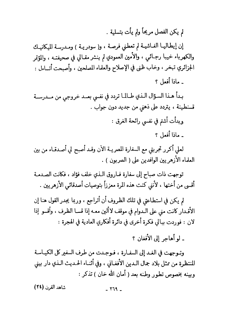 إن إيطاليا الفاشية لم تعطني فرصة، و (سودرية) ومدرسة الميكانيك والكهرباء خيبا رجائي، والأمين العمودي لم ينشر مقالي في صحيفته، والمؤتمر الجزائري تبخر، وخاب ظني في الإصلاح والعلماء المصلحين، وأصحت أتساءل: - ماذا أفعل؟