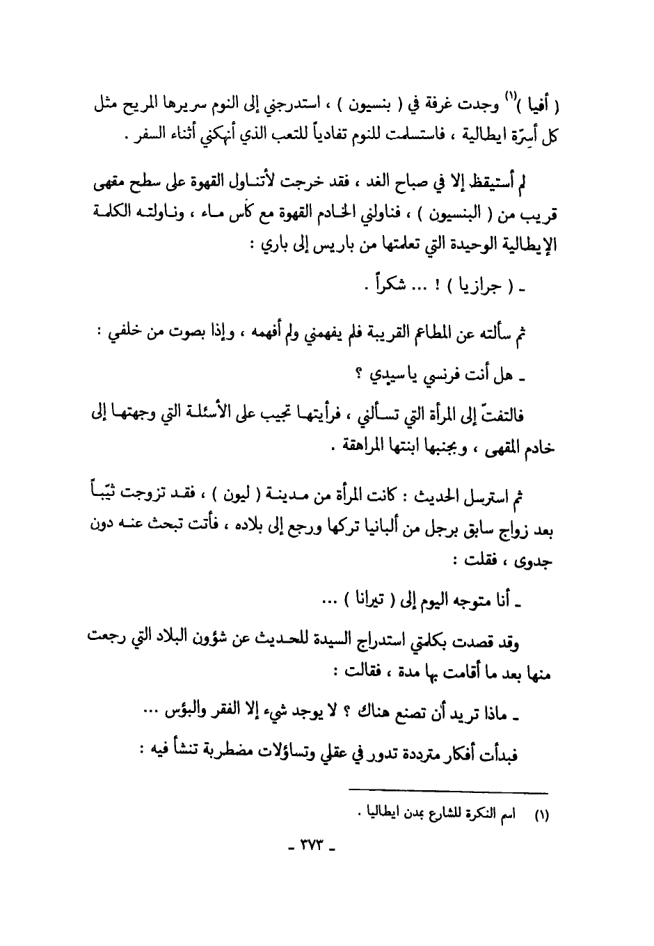 لم أستيقظ إلا في صباح الغد، فقد خرجت لأتناول القهوة على سطح مقهى قريب من (البنسيون)، فناولني الخادم القهوة مع كأس ماء، وناولته الكلمة الإيطالية الوحيدة التي تعلمتها من باريس إلى باري:
