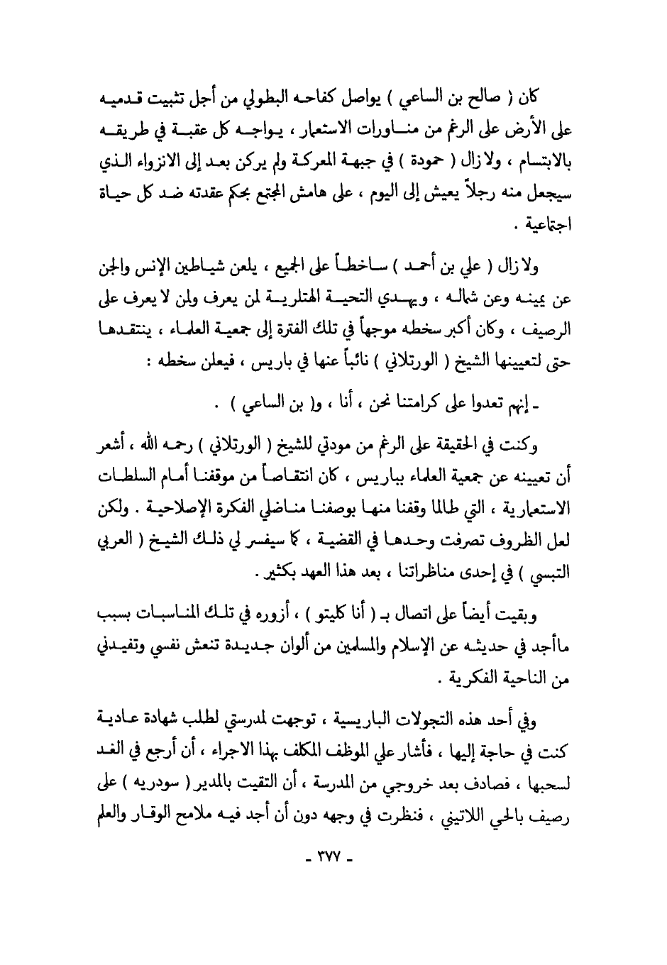 وكنت في الحقيقة على الرغم من مودتي للشيخ (الورتلاني) رحمه الله، أشعر أن تعيينه عن جمعية العلماء بباريس، كان انتقاصاً من موقفنا أمام السلطات الاستعمارية، التي طالما وقفنا منها بوصفنا مناضلي الفكرة الإصلاحية. ولكن لعل الظروف تصرفت وحدها في القضية كما سيفسر لي ذلك الشيخ (العربي التبسي) في إحدى مناظراتنا، بعد هذا العهد بكثير.