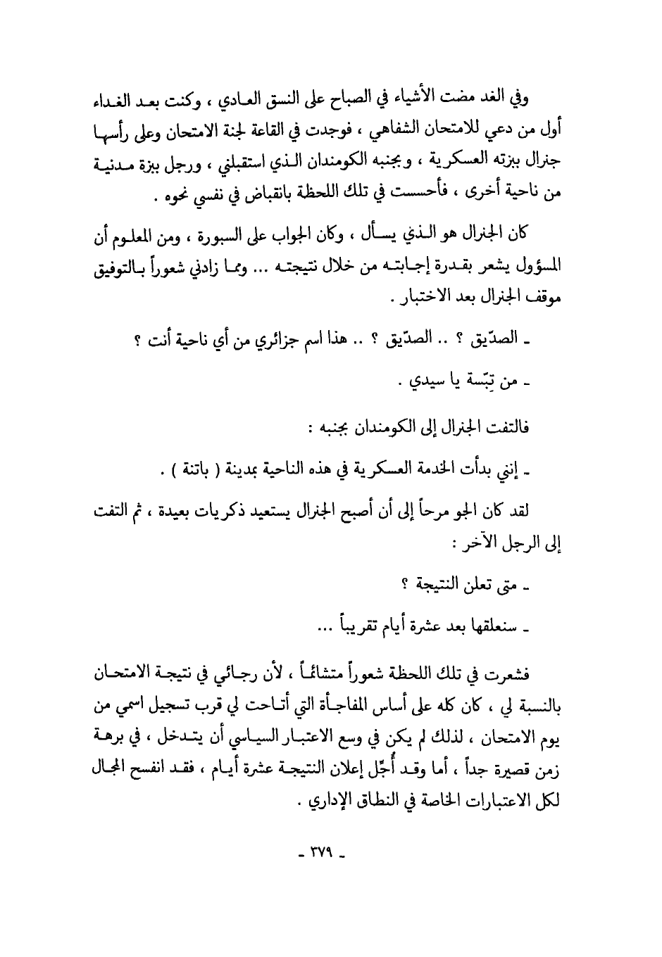 وفي الغد مضت الأشياء في الصباح على النسق العادي، وكنت بعد الغداء أول من دعي للامتحان الشفاهي، فوجدت في القاعة لجنة الامتحان وعلى رأسها جنرال ببزته العسكرية، وبجنبه الكومندان الذي استقبلني، رجل ببزة مدنية من ناحية أخرى، فأحسست في تلك اللحظة بانقباض في نفسي نحوه.