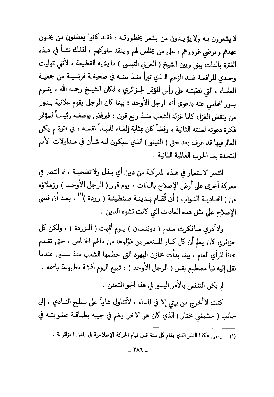 لا يشعرون به ولا يؤيدون من يشعر بخطورته، فقد كانوا يفضلون من يخون عهدهم ويرضي غرورهم، على من يخلص لهم وينقد سلوكهم، لذلك نشأ في هذه الفترة بالذات بيني وبين الشيخ (العربي التبسي) ما يشبه القطيعة، لأنني توليت وحدي المرافعة ضد الزعيم الذي تبرأ منذ سنة في صحيفة فرنسية من جمعية العلماء، التي نصّبته على رأس المؤتمر الجزائري، فكان الشيخ رحمه الله، يقوم بدور المحامي عنه بدعوى أنه الرجل الأوحد؛ بينما كان الرجل يقوم علانية بدور من ينقض الغزل كلما غزله الشعب منذ ربع قرن؛ فيرفض بوصفه رئيساً للمؤتمر فكرة دعوته لسنته الثانية، رفضاً كان بمثابة إلغاء لمبدأ نفسه، في فترة لم يكن العالم فيها قد عرف بعد حق (الفيتو) الذي سيكون له شأن في مداولات الأمم المتحدة بعد الحرب العالمية الثانية.