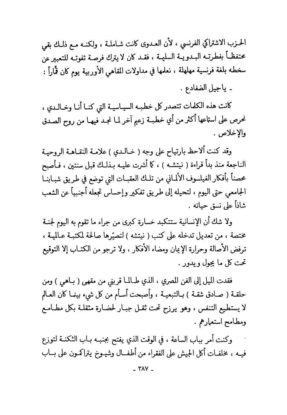 الحزب الاشتراكي الفرنسي، لأن العدوى كانت شاملة، ولكنه مع ذلك بقي محتفظاً بفطرته البدوية السليمة، فقد كان لا يترك فرصة تفوته للتعبير عن سخطه بلغة فرنسية مهلهلة، نعلمها في مداولات المقاهي الأوربية يوم كان قمَّاراً: