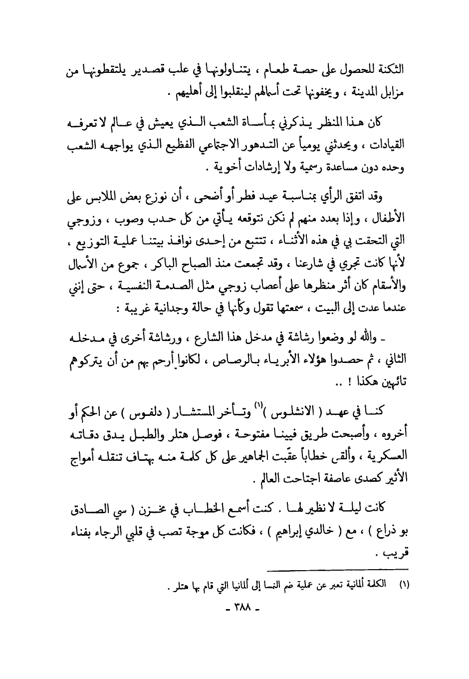كنا في عهد (الانشلوس) (¬1) وتأخر المستشار (دلفوس) عن الحكم أو أخروه، وأصبحت طريق فيينا مفتوحة، فوصل هتلر والطبل يدق دقاته العسكرية، وألقى خطاباً عقّبت الجماهير على كل كلمة منه بهتاف تنقله أمواج الأثير كصدى عاصفة اجتاحت العالم.