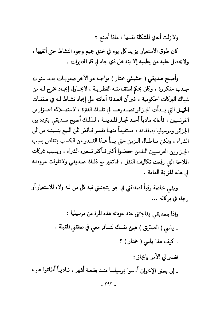 وأصبح صديقي (حشيشي مختار) يواجه هو الآخر صعوبات بعد سنوات جدب متكررة، وكان بحكم استقامته الفطرية، لا يحاول إيجاد مخرج له من شباك البركات الحكومية، غير أن الصدفة أعانته على إيجاد نشاط له في صفقات الحيل التي بدأت الجزائر تصدرها في تلك الفترة، لاستهلاك الجزارين الفرنسيين؛ فأعانه مادياً أحد تجار المدينة، لذلك أصبح صديقي يتردد بين الجرائر ومرسيليا بصفقاته، مستفيداً منها بقدر فائض ثمن البيع بنسبته من ثمن الشراء، ولكن ما طال الزمن حتى بدأ هذا القدر من الكسب يتقلص بسبب الجزارين الفرنسيين الذين خفضوا أكثر فأكثر تسعيرة الشراء، وبسبب شركات الملاحة التي رفعت تكاليف النقل، فما تغير مع ذلك صديقي ولا تلوثت مروءته في هذه الهزيمة العامة.