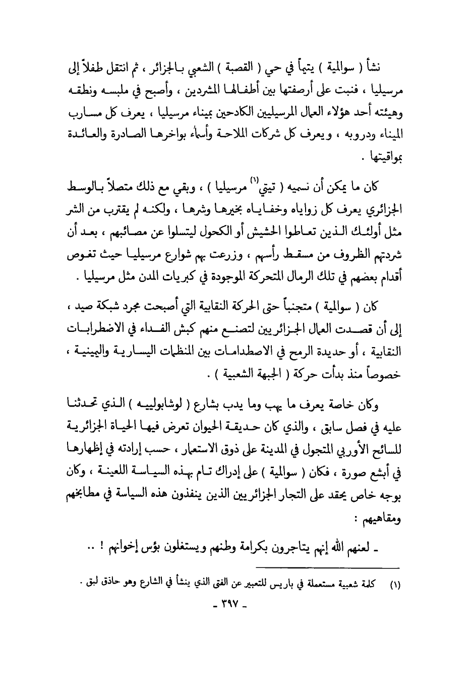 كان ما يمكن أن نسميه (تيتي (¬1) مرسيليا)، وبقي مع ذلك متصلاً بالوسط الجزائري يعرف كل زواياه وخفاياه بخيرها وشرها، ولكنه لم يقترب من الشر مثل أولئك الذين تعاطوا الحشيش أو الكحول ليتسلوا عن مصائبهم، بعد أن شردتهم الظروف من مسقط رأسهم، وزرعت بهم شوارع مرسيليا حيث تغوص أقدام بعضهم في تلك الرمال المتحركة الموجودة في كبريات المدن مثل مرسيليا. كان (سوالمية) متجنباً حتى الحركة النقابية التي أصبحت مجرد شبكة صيد، إلى أن قصدت العمال الجزائريين لتصنع منهم كبش الفداء في الاضطرابات النقابية، أو حديدة الرمح في الاصطدامات بين المنظمات اليسارية واليمينية، خصوصاً منذ بدأت حركة (الجبهة الشعبية).