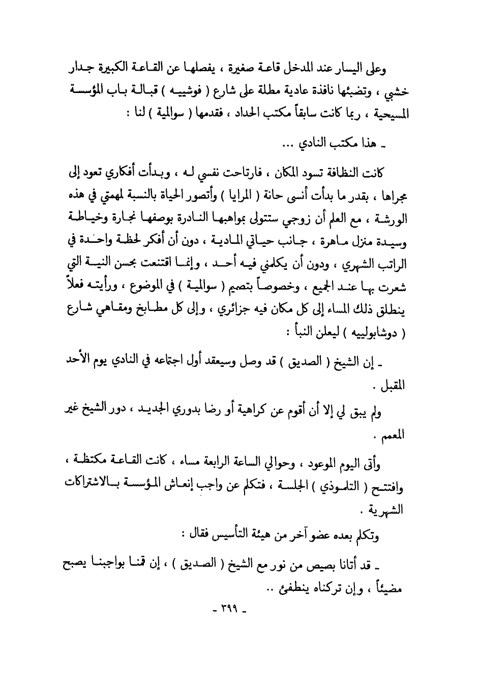 كانت النظافة تسود المكان، فارتاحت نفسي له، وبدأت أفكاري تعود إلى مجراها، بقدر ما بدأت أنسى حانة (المرايا) وأتصور الحياة بالنسبة لمهمتي في هذه الورشة، مع العلم أن زوجي ستتولى بمواهبها النادرة بوصفها نجارة وخياطة وسيدة منزل ماهرة، جانب حياتي المادية، دون أن أفكر لحظة واحدة في الراتب الشهري، ودون أن يكلمني فيه أحد، وإنما اقتنعت بحسن النية التي شعرت بها عند الجميع، وخصوصاً بتصميم (سوالمية) في الموضوع، ورأيته فعلاً ينطلق ذلك المساء إلى كل مكان فيه جزائري، وإلى كل مطابخ ومقاهي شارع (دوشابولييه) ليعلن النبأ: