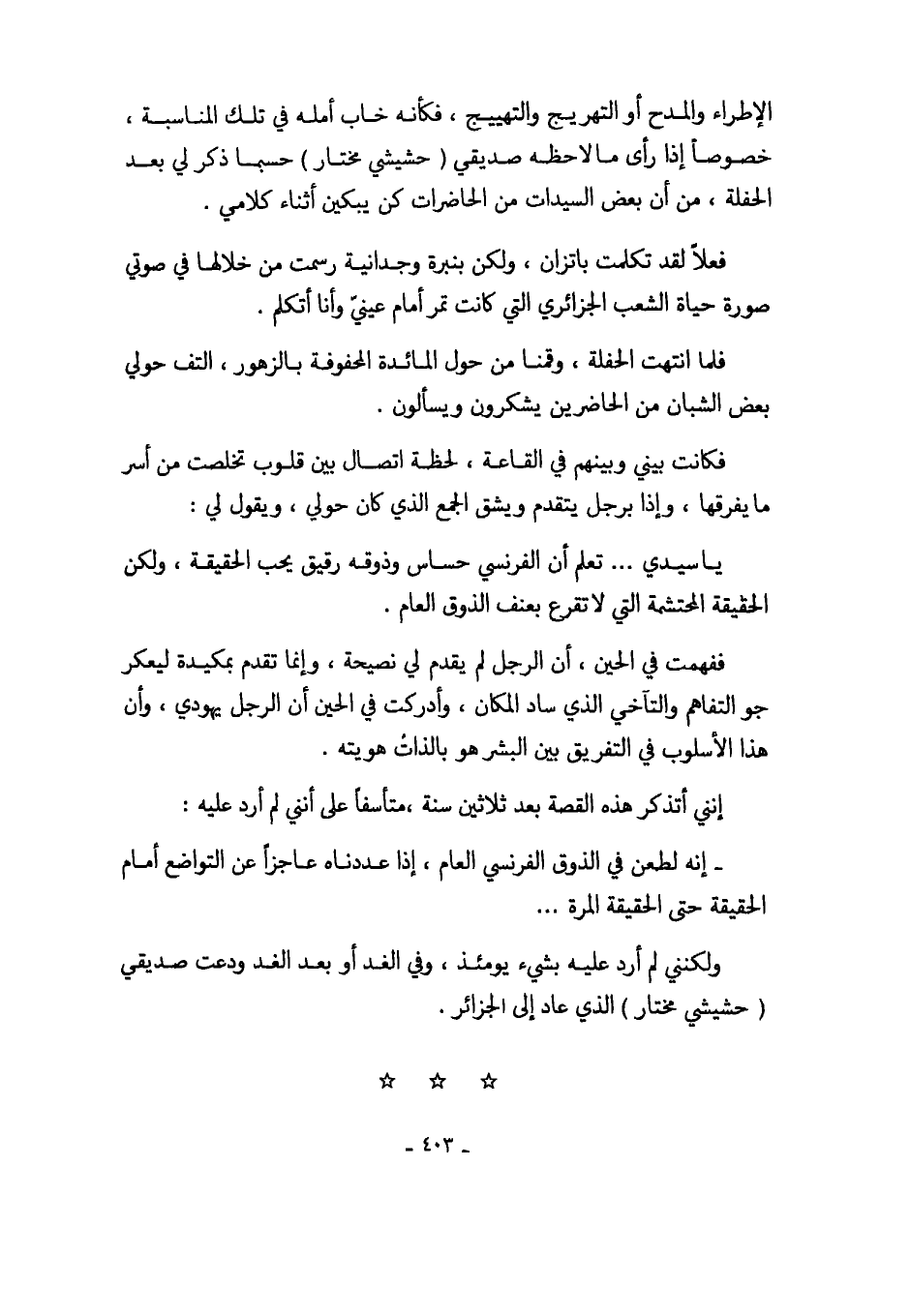 ولكنني لم أرد عليه بشيء يومئذ، وفي الغد أو بعد الغد ودعت صديقي (حشيشي مختار) الذي عاد إلى الجزائر.